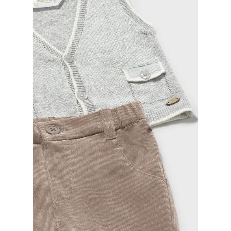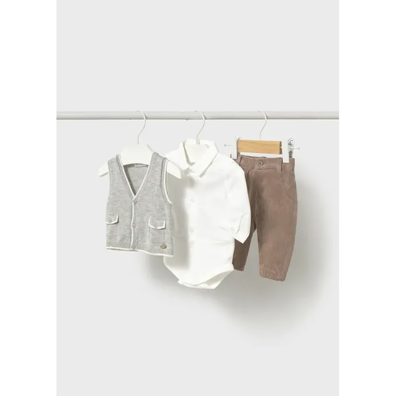Elegancki komplet 3-częściowy dla chłopca składający się z dzianinowej kamizelki, body oraz długich spodni. Kamizelka z dekoltem w serek zapinana na guziki. Koszulo-body z długim rękawem. Eleganckie spodnie ze ściągaczem.