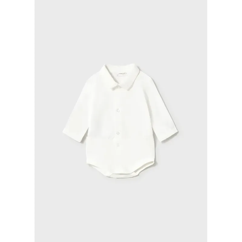 Komplet składający się z koszuli i pasujących krótkich spodni dla chłopca. Koszula z długim rękawem z tasiemką i guzikiem z boku do regulacji długości rękawa. Z przodu ozdobna kamizelka zszyta z koszulą. Krótkie spodnie typu bermudy.