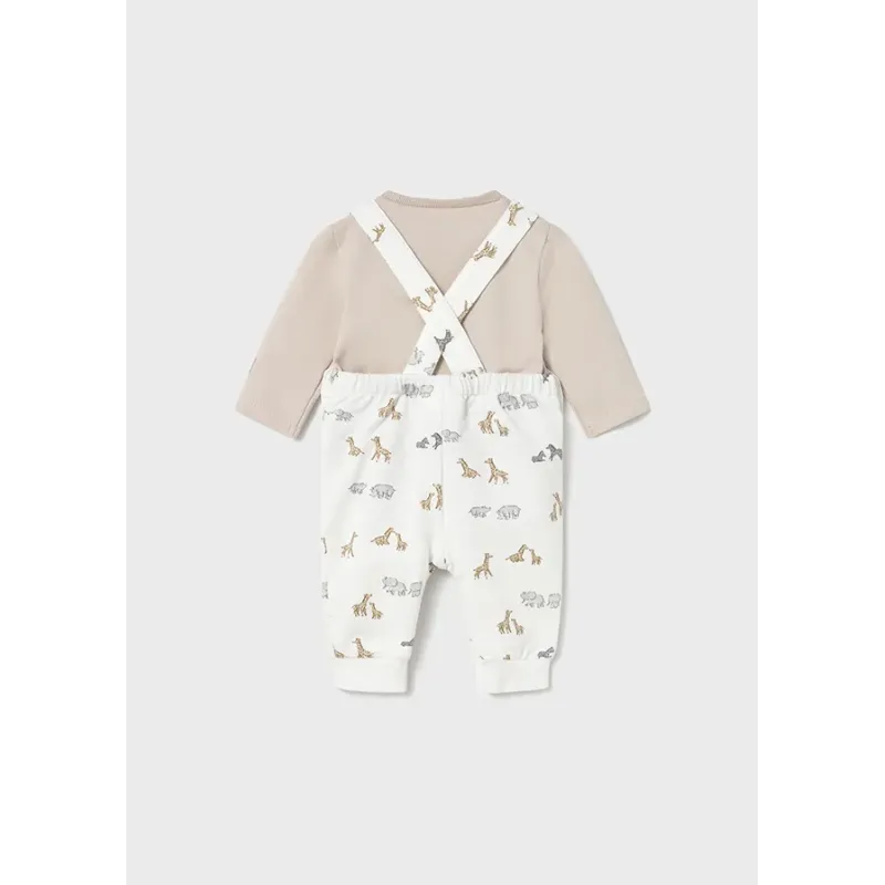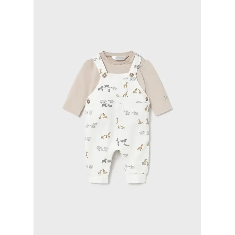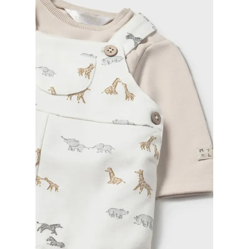 Komplet dla chłopca składający się z długich spodni ogrodniczek oraz koszulki z długim rękawem. Bawełniana, gładka koszulka z zapięciem na zatrzaski na ramieniu. Bawełniane ogrodniczki we wzory. Skład: 94% Bawełna, 6% Elastan.