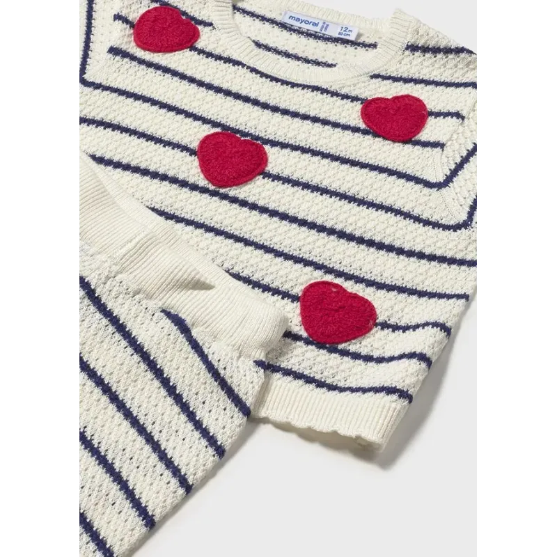 Komplet sweterek z pasującymi długimi spodniami dla dziewczynki. Sweter w paski. Okrągły dekolt. Zapięcie na guziczki na plecach. Dzianinowe spodnie ze zwężanymi nogawkami. Skład: 47% Wiskoza, 30% Poliamid, 23% Poliester.
