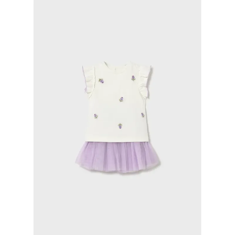 Komplet 2-częściowy ze spódnicą z tiulu dla dziewczynki. Koszulka z krótkim rękawkiem. Okrągły dekolt. Krótka spódniczka dla dziewczynki. Elastyczna gumka w pasie dla lepszego dopasowania. Motyw w kwiaty.