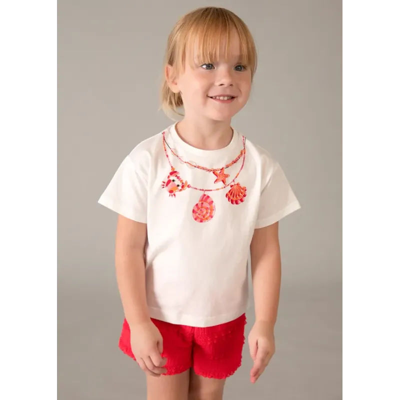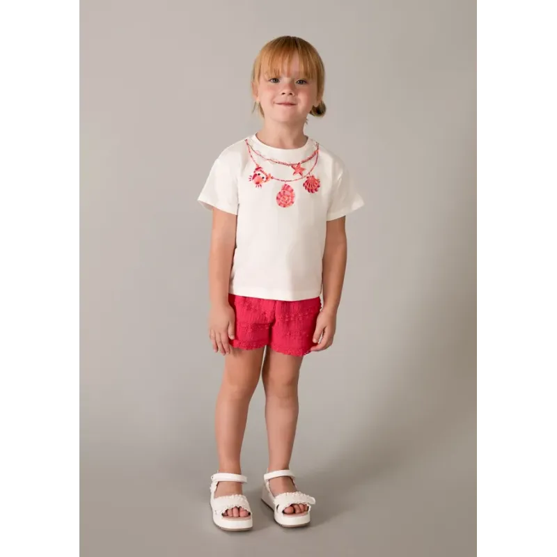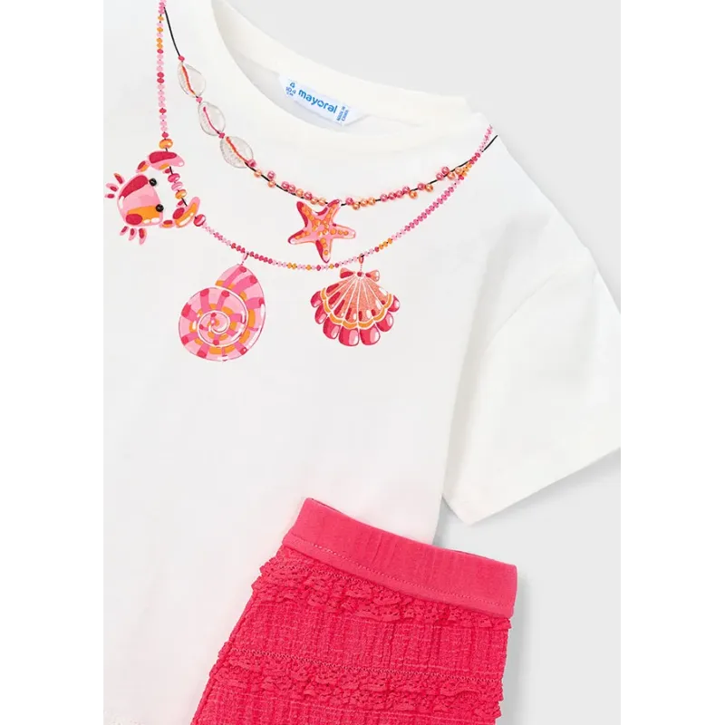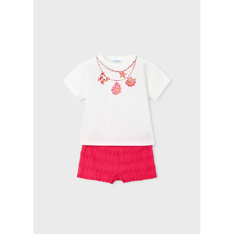 Komplet dwóch artykułów składający się z koszulki ze spodniami typu leginsy dla noworodka dziewczynki. Koszulka z krótkim rękawem wyonana ze 100% bawełny. Okrągły dekolt. Delikatna i elastyczna bawełna. Krótkie leginsy we wzory. Pasująca opaska.