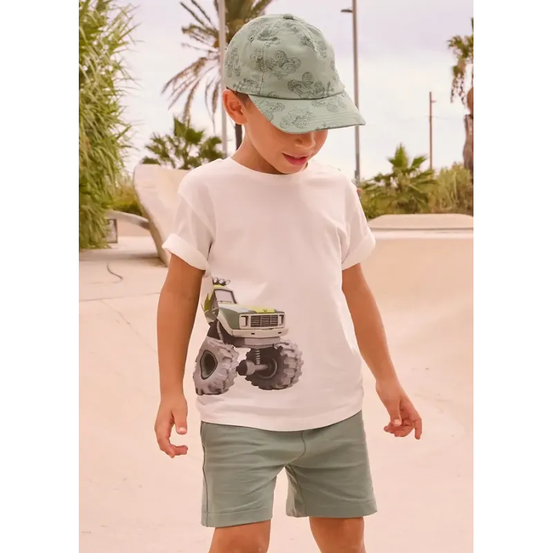 Komplet koszulka i bermudy dla chłopca Baby. Koszulka z krótkim rękawem. Okrągły dekolt. Pasujące krótkie spodenki we wzory. Elastyczny pas ze sznurkiem do regulacji. W zestawie z kapeluszem. Zestaw wykonany ze 100% bawełny.