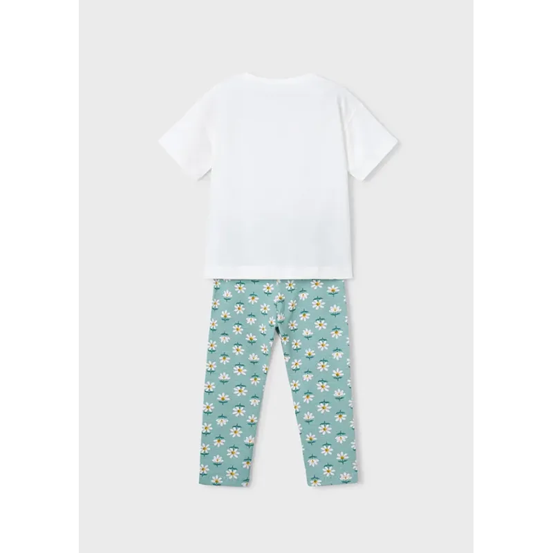 Ubranko ECOFRIENDS, zawiera bawełnę przetworzoną. Komplet koszulka i spodnie piratki typu leginsy dla dziewczynki. Koszula z krótkim rękawem dla dziewczynki. Okrągły dekolt. Ozdoby: grafika na przodzie.