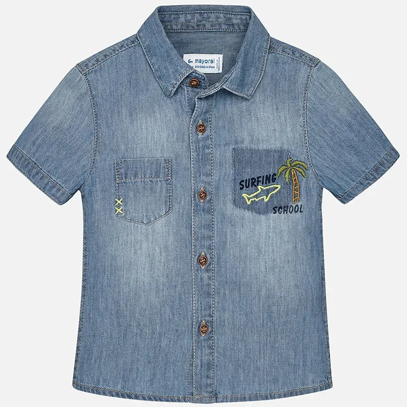 Koszula z krótkim rękawem z bawełny zrównoważonej dla chłopca. Ubranko ECOFRIENDS 100% zrównoważona bawełna. Kołnierzyk koszulowy. Zapięcie z przodu na guziki. Z przodu funkcjonalna kieszeń.