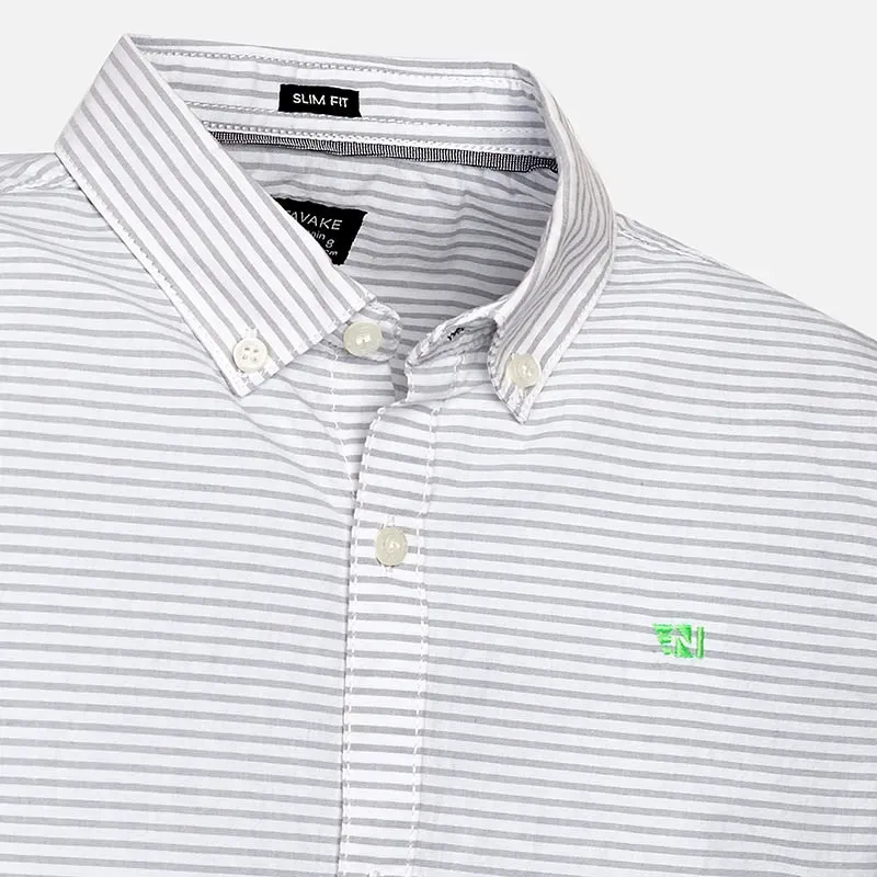 Koszula z krótkim rękawem dla chłopca. Model ze stójką w pasującym kolorze. Zapięcie z przodu na guziki. Wygodna tkanina popelinowa, charakteryzująca się trwałością i łatwością utrzymania. Motyw w paski.