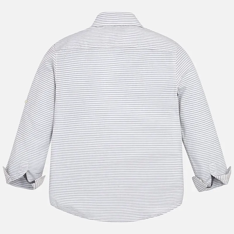 Koszula z długim rękawem dla chłopca z mankietem zapinanym na guziki. Kołnierzyk koszulowy. Zapięcie z przodu na guziki. Lekki i modny materiał z domieszką lnu. Z przodu funkcjonalna kieszeń. Skład: 62% Bawełna, 38% Len.