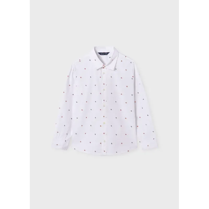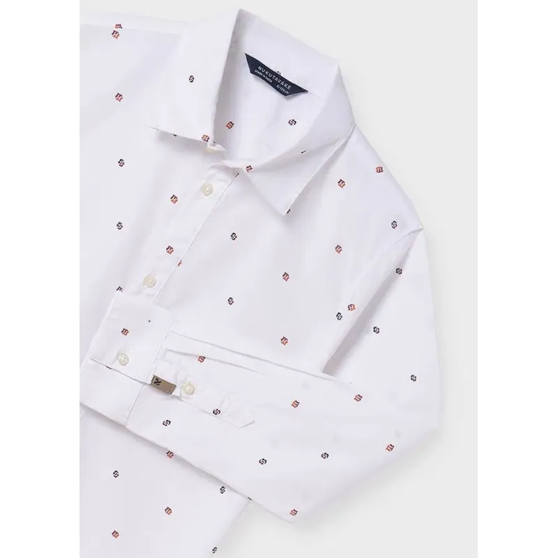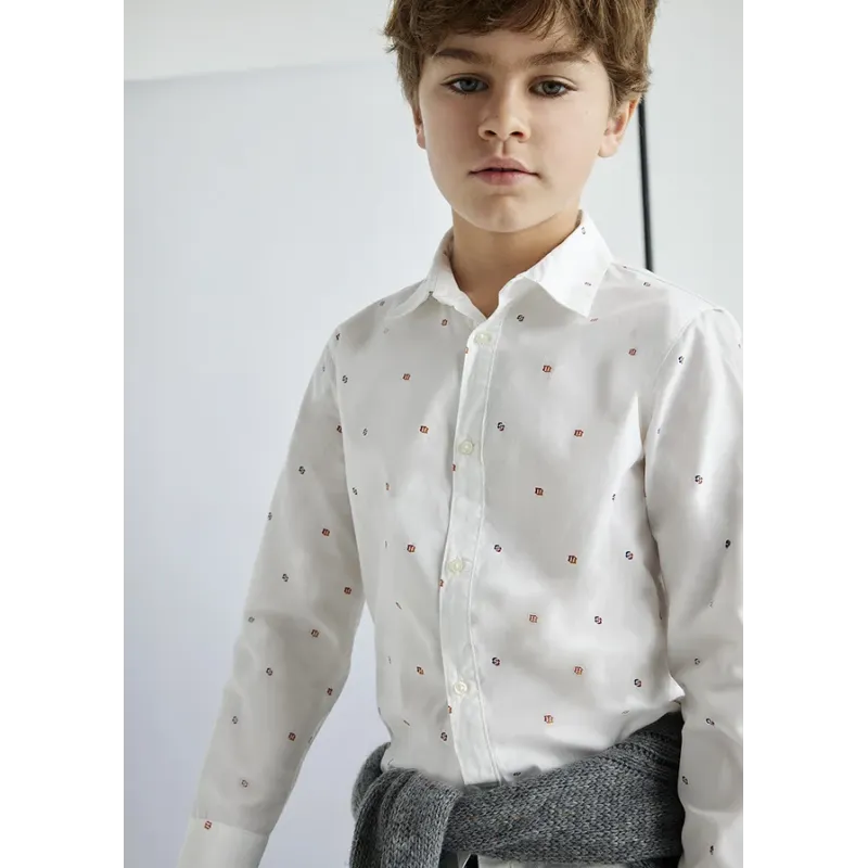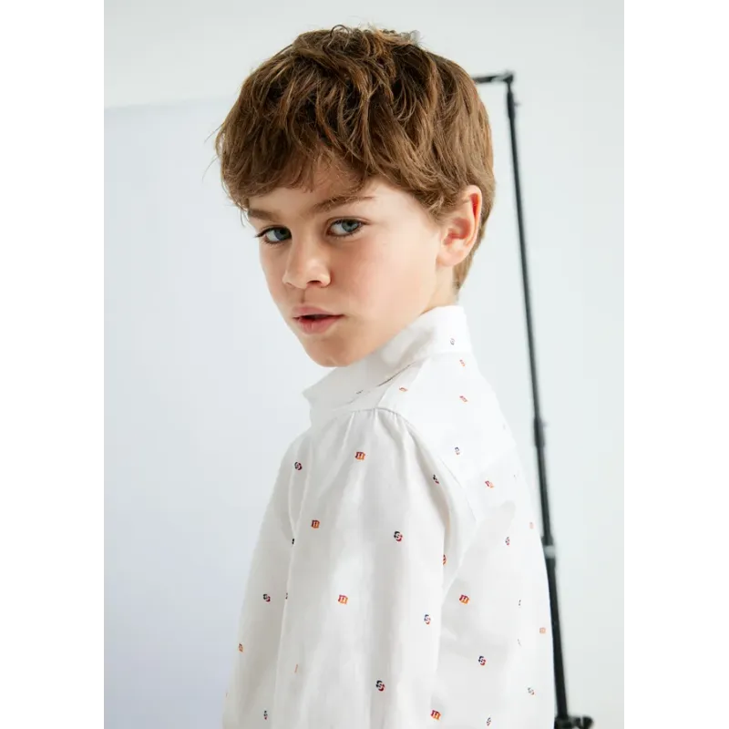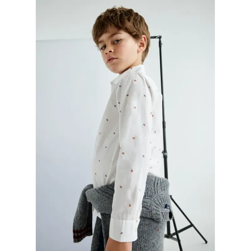 Koszula z długim rękawem dla chłopca. Model z klasycznym kołnierzykiem koszulowym. Zapięcie z przodu na guziki. Wygodna tkanina, charakteryzująca się trwałością i łatwością utrzymania. Projekt we wzory. Skład: 100% Bawełna.