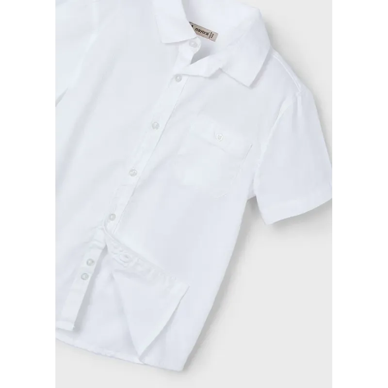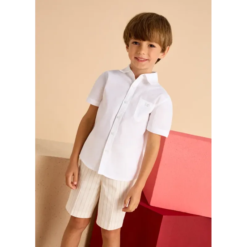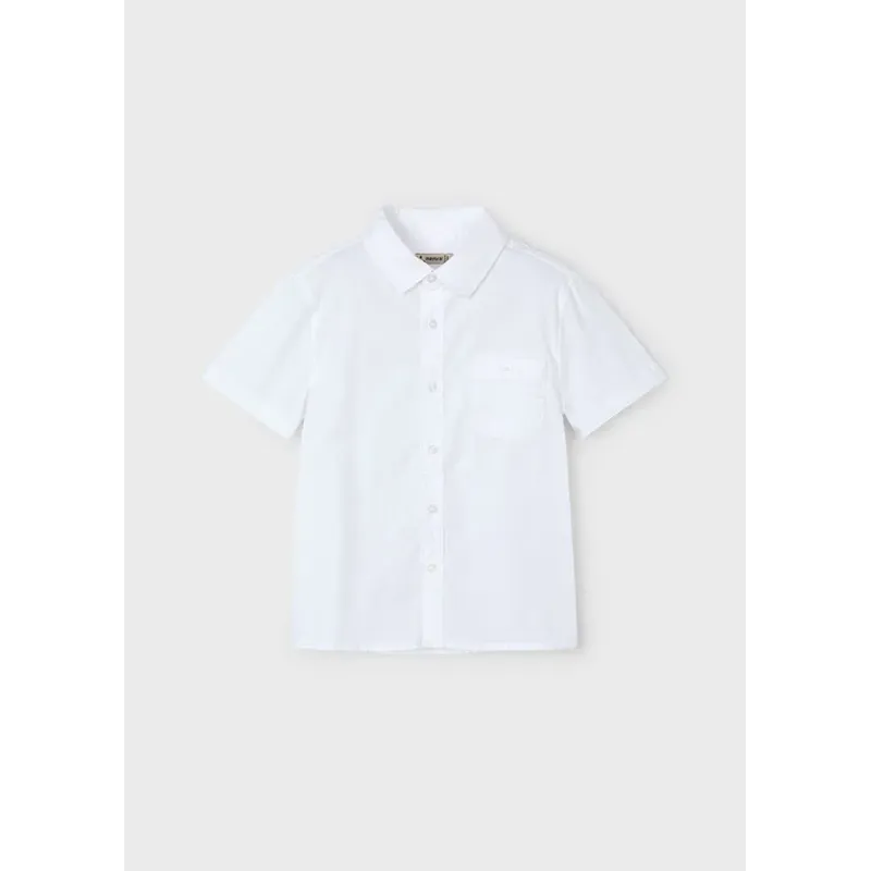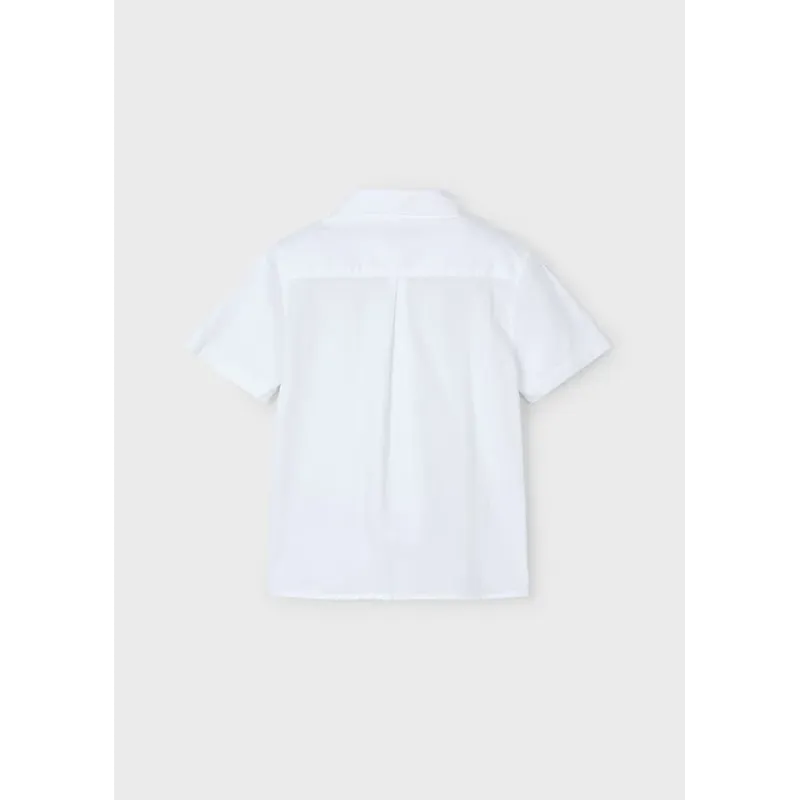 Klasyczna koszula z krótkim rękawem z bawełny zrównoważonej dla chłopca. Kołnierzyk koszulowy. Zapięcie z przodu na guziki. Z przodu funkcjonalna kieszeń.