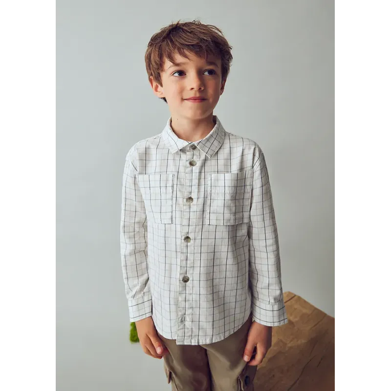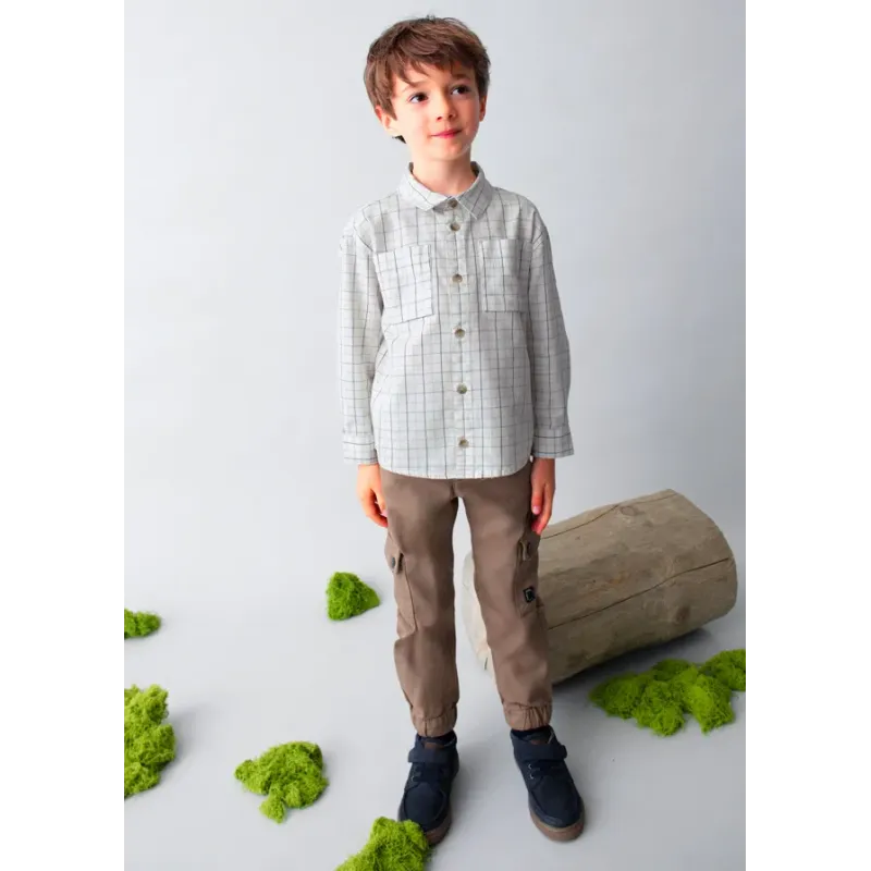 Koszula z długim rękawem dla chłopca z mankietem zapinanym na guziki. Kołnierzyk koszulowy. Zapięcie z przodu na guziki. Wygodna i lekka tkanina. Z przodu funkcjonalne kieszenie. Motyw w kratę. Artykuł wykonany ze 100% bawełny.
