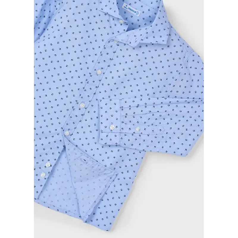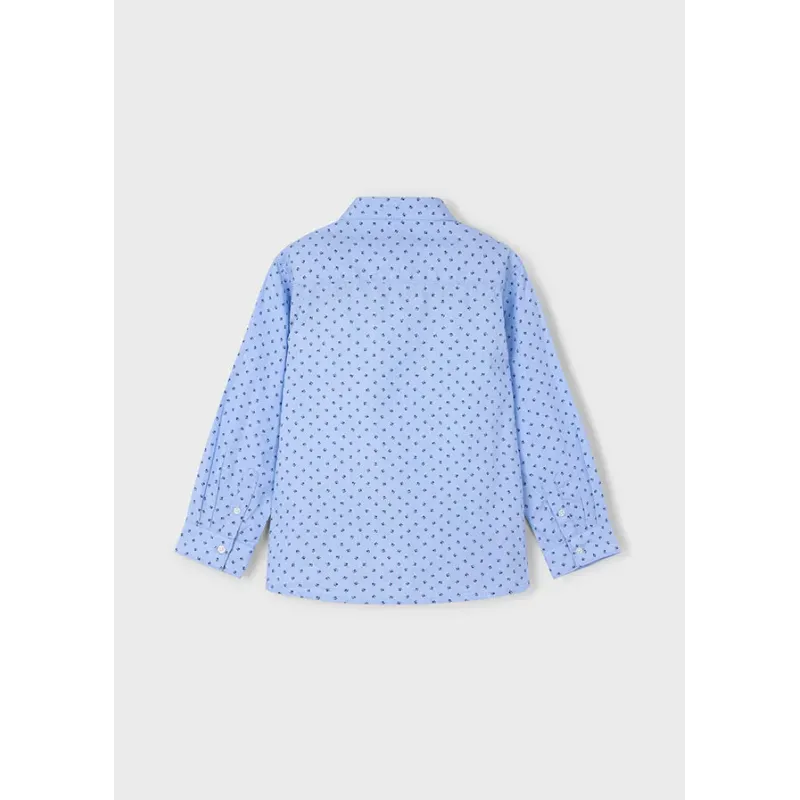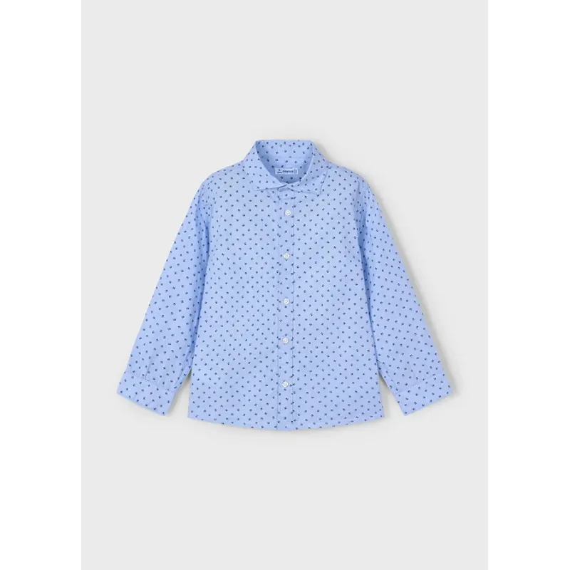 Koszula z długim rękawem dla chłopca. Model z klasycznym kołnierzykiem koszulowym. Zapięcie z przodu na guziki. Wygodna tkanina, charakteryzująca się trwałością i łatwością utrzymania. Projekt we wzory. Skład: 100% Bawełna.