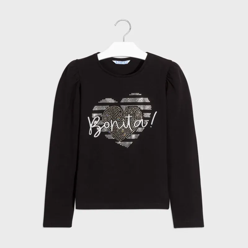 Koszulka z długim rękawem dla dziewczyny. Okrągły dekolt. Delikatna i elastyczna bawełna. Ozdoby: napis na przodzie ubranka. Skład: 100% Bawełna.