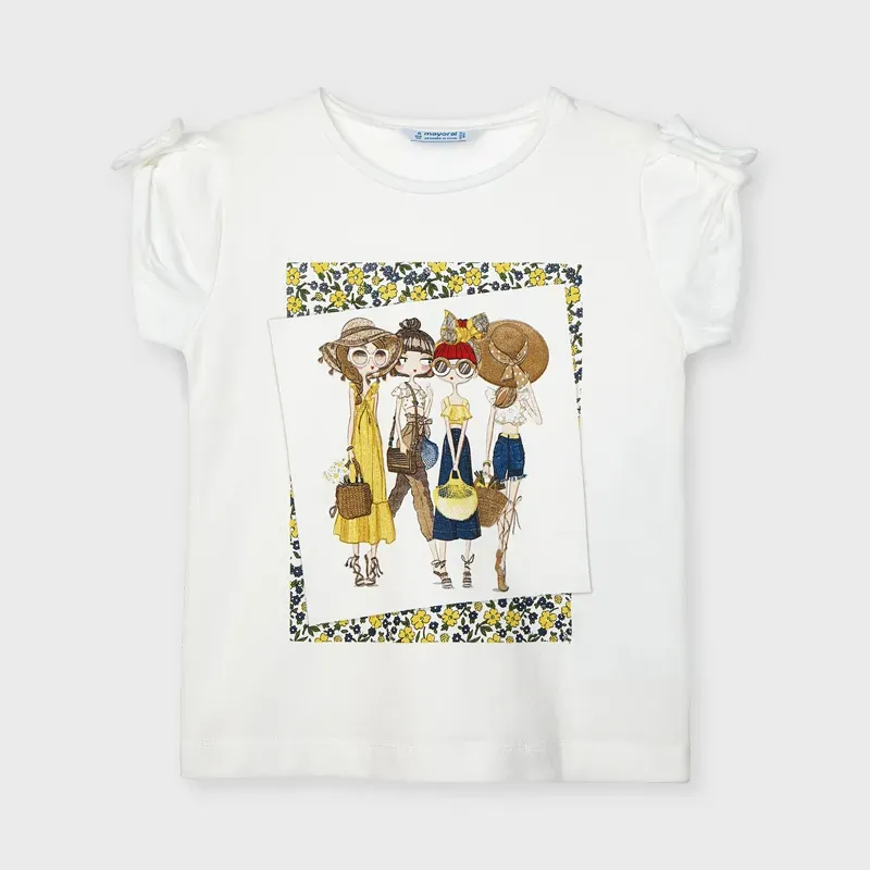 Koszulka z krótkim rękawem dla dziewczynki. Okrągły dekolt. Delikatna i elastyczna bawełna. Ubranko wykonane ze 100% bawełny. Model z marszczeniami. Ozdoby: grafika na przodzie.