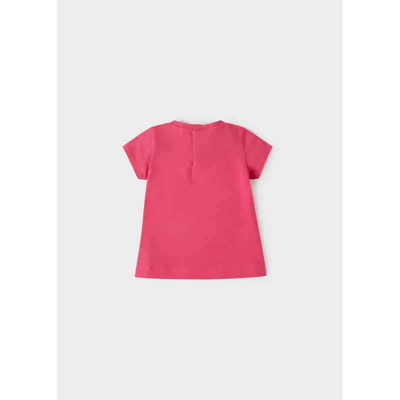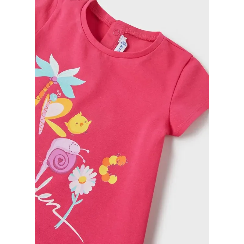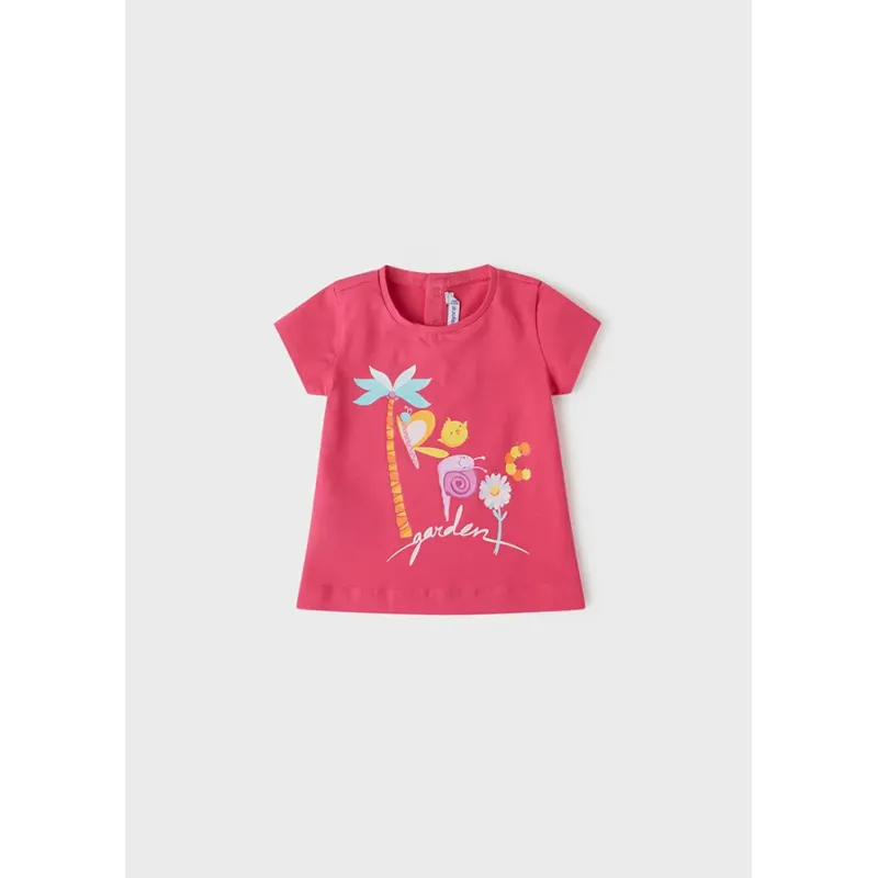 Koszulka z krótkim rękawem dla dziewczynki Baby. Okrągły dekolt. Zapięcie na małe zatrzaski na plecach, które ułatwiają założenie ubranka. Delikatna i elastyczna bawełna. Ozdoby: grafika na przodzie.