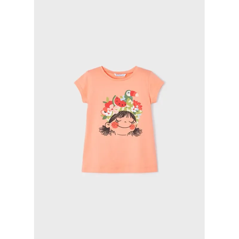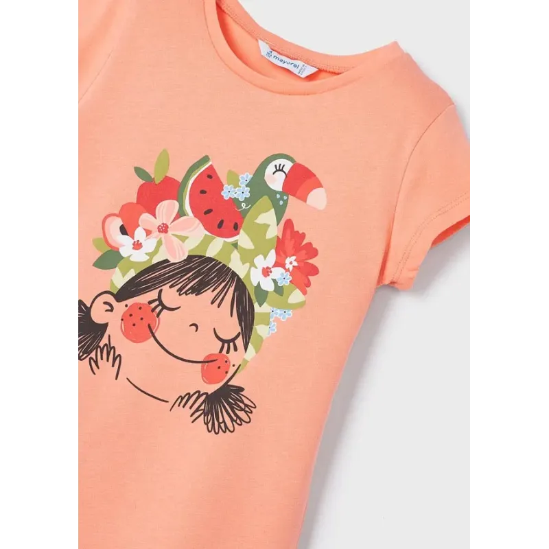 Koszulka z krótkim rękawem z nadrukiem dla dziewczynki. Okrągłu dekolt. Projekt z nadrukiem. Szeroki rękawek.