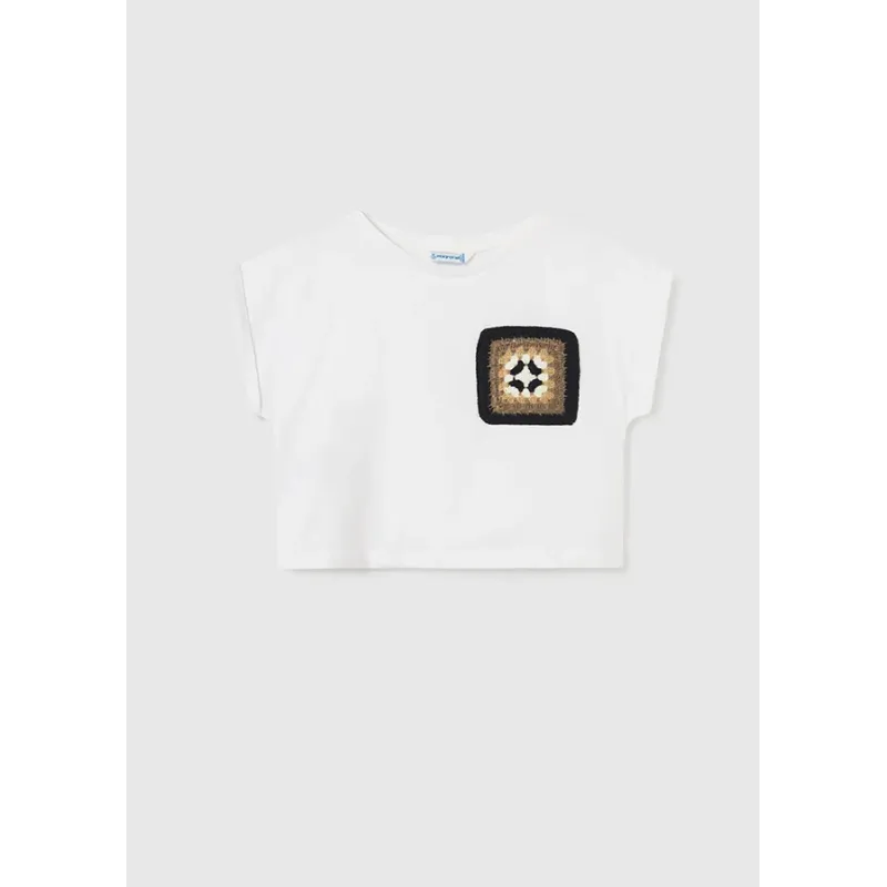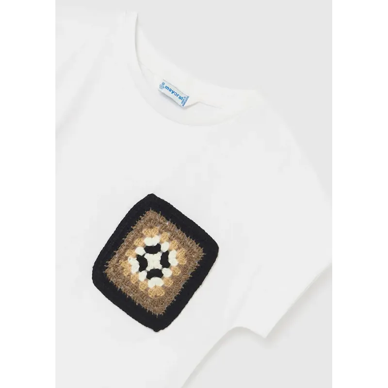 Koszulka z krótkim rękawem dla dziewczynki. Okrągły dekolt. Model gładki. Koronkowa kieszonka z frędzlami. Miękka i zwiewna tkanina. Artykuł wykonany z 97% Bawełny, 3% Poliestru.