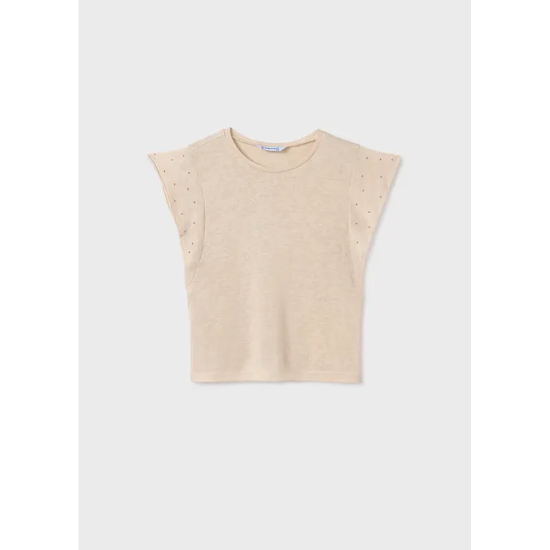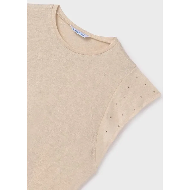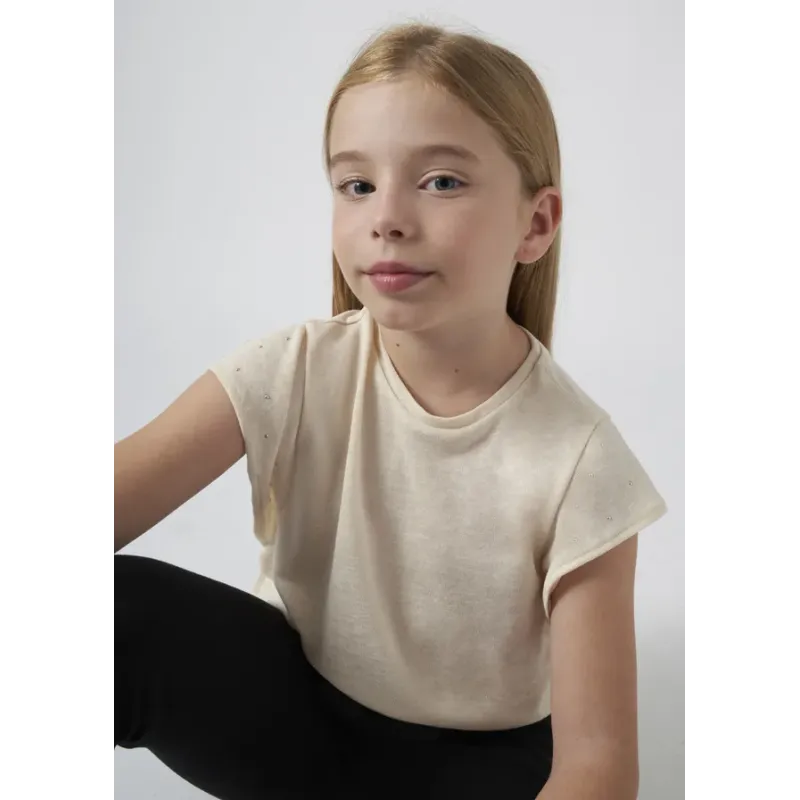 Koszulka z krótkim rękawem z nitami dla dziewczyny. Okrągły dekolt. Wygodna dzianina. Ozdoby: elementy z imitacji biżuterii. Skład: 55% Wiskoza, 45% Poliester