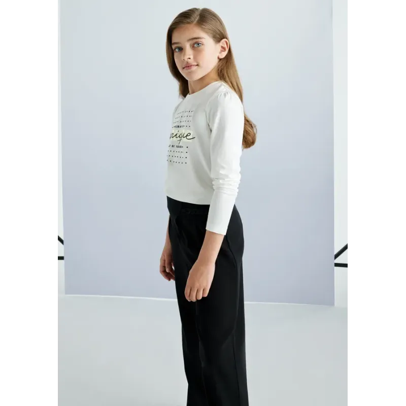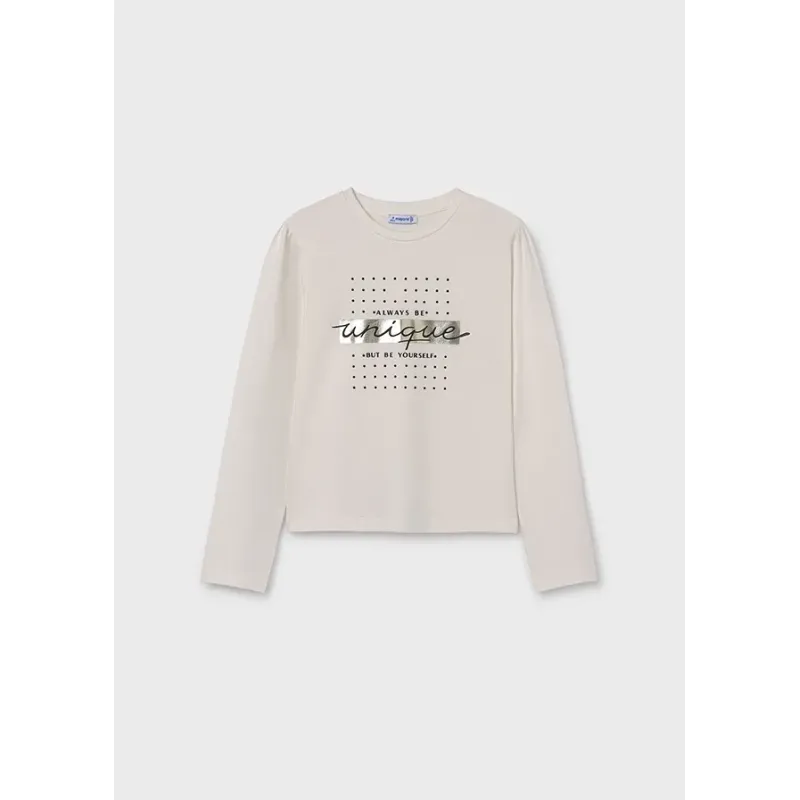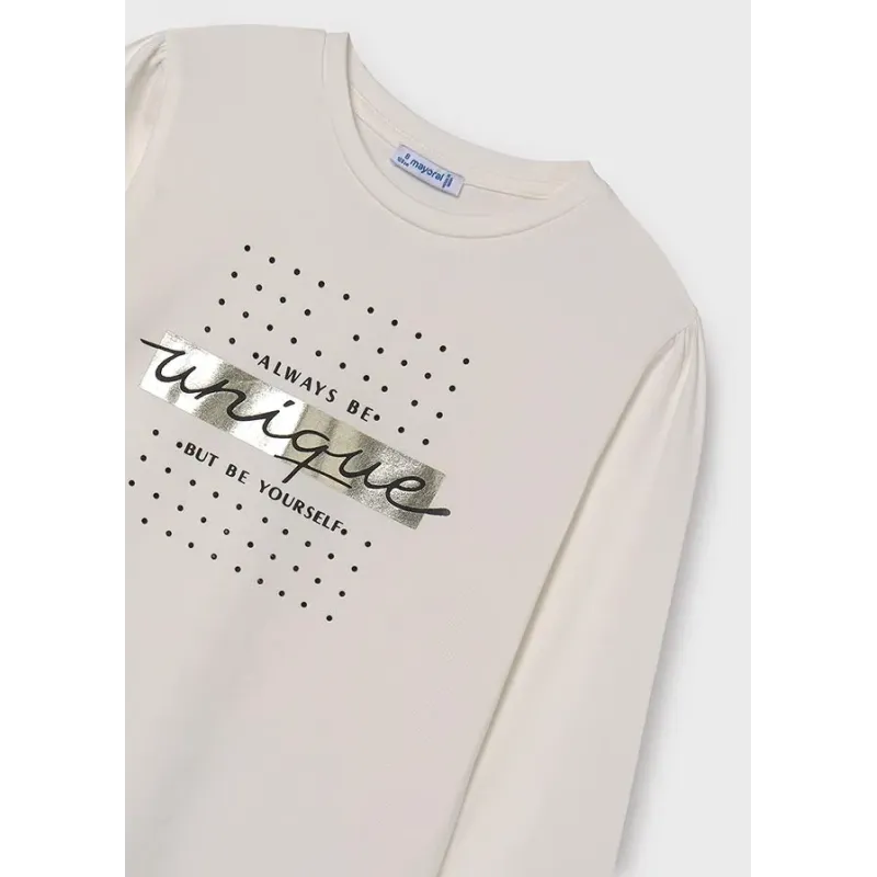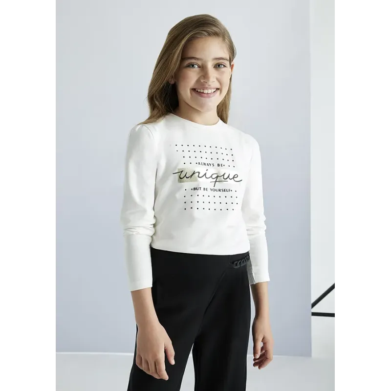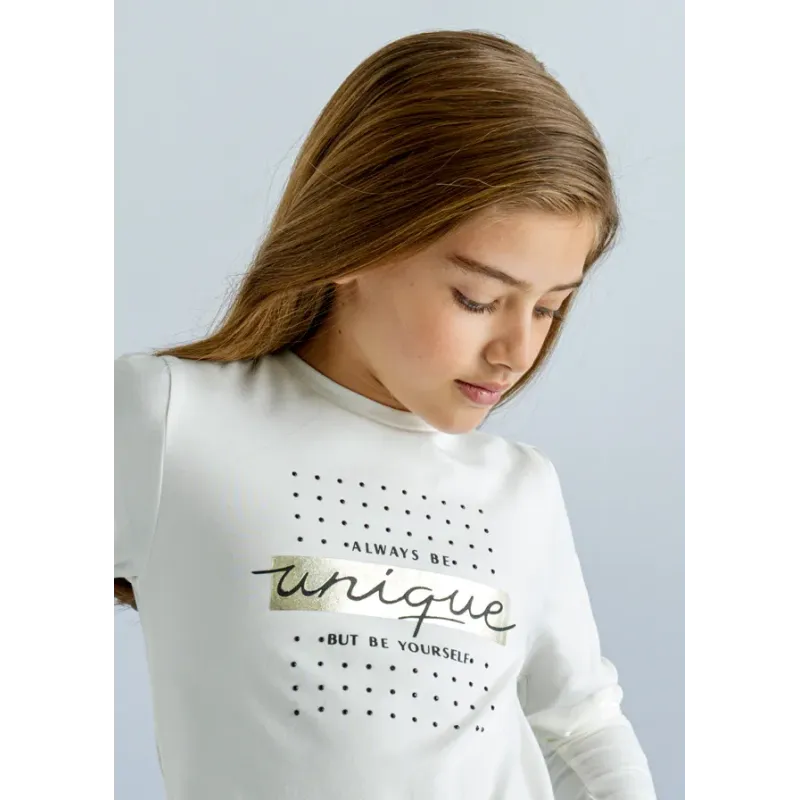 Koszulka z długim rękawem dla dziewczyny. Okrągły dekolt. Delikatna i elastyczna bawełna. Ozdoby: napis na przodzie ubranka. Skład: 100% Bawełna.