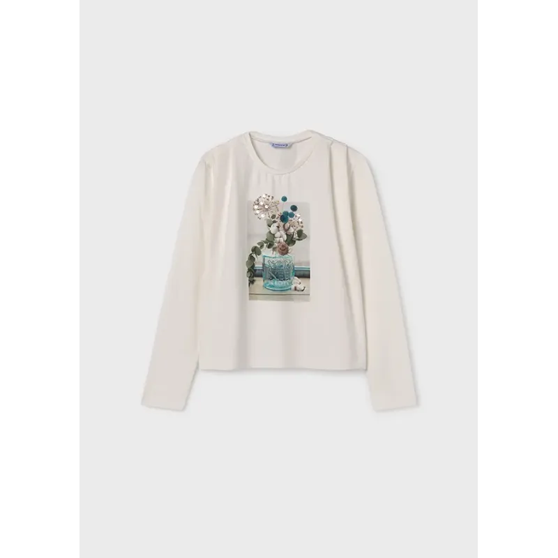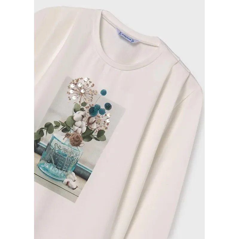 Koszulka z długim rękawem dla dziewczyny. Okrągły dekolt. Delikatna i elastyczna bawełna. Ozdoby: grafika na przodzie ubranka. Skład: 95% Bawełna 5% Elastan