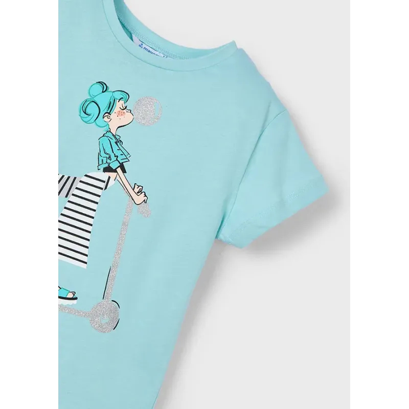 Koszulka z krótkim rękawem z nadrukiem dla dziewczynki. Okrągłu dekolt. Projekt z nadrukiem. Szeroki rękawek.