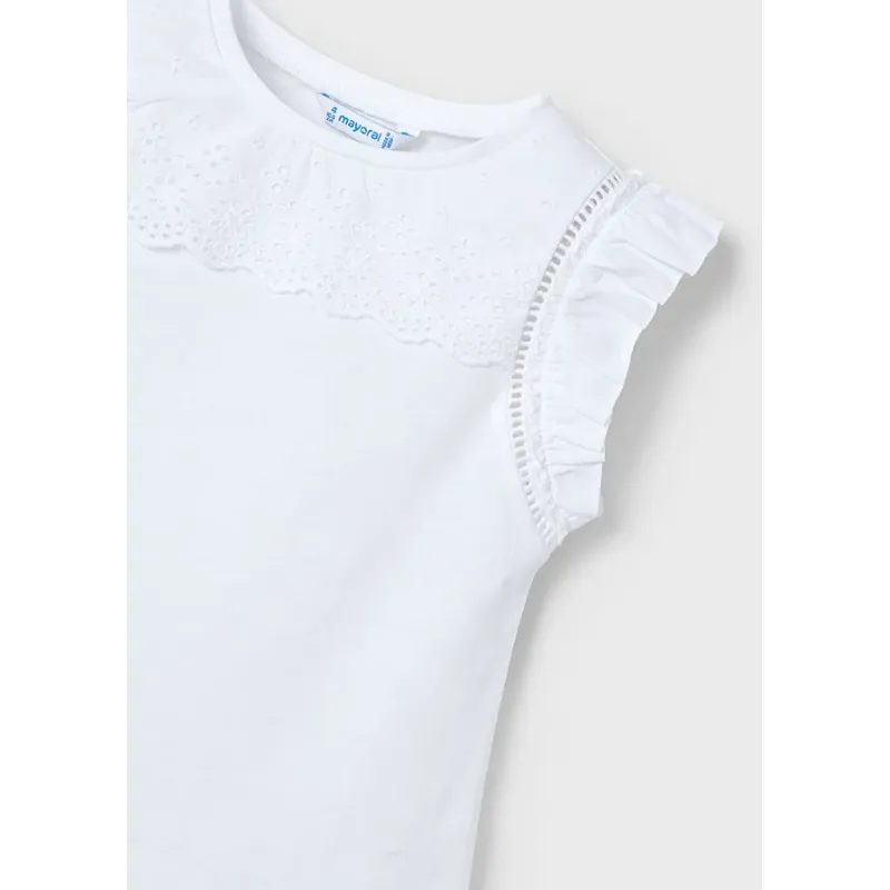 Koszulka na ramiączkach z ażurową falbanką dla dziewczynki. Skład: 98% Bawełna, 2% Elastan.