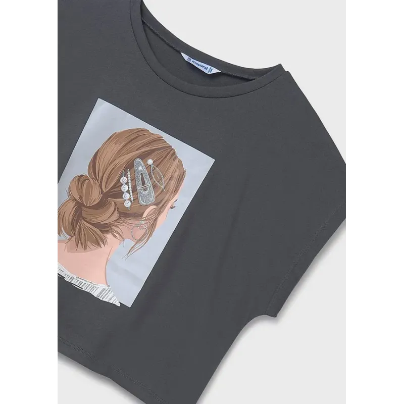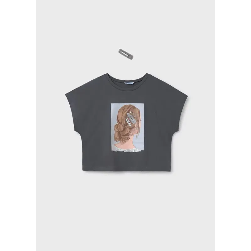 Szeroka koszulka z krótkim rękawem dla dziewczynki. Okrągły dekolt. Projekt z nadrukiem. W zestawie z pasującą spinką do włosów. Skład: 100% Bawełna.