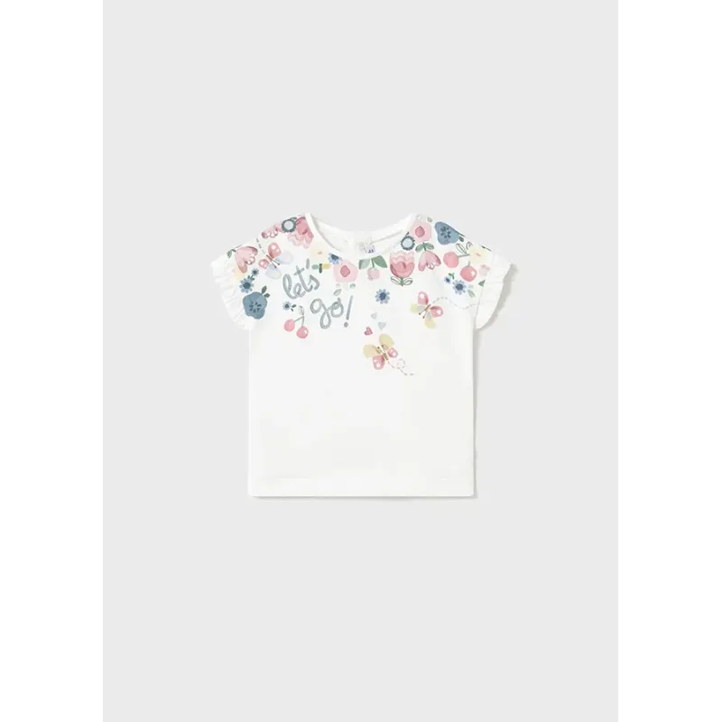 Koszulka z krótkim rękawem dla dziewczynki. Rękawek wykończony falbanką. Okrągły dekolt. Model z nadrukiem. Zapięcie na plecach na zatrzaski. Skład: 95% Bawełna, 5% Elastan.