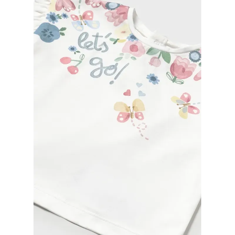 Ubranko ECOFRIENDS, zawiera bawełnę przetworzoną. Koszulka z krótkim rękawem dla dziewczynki Baby. Okrągły dekolt. Zapięcie na małe zatrzaski na plecach, które ułatwiają założenie ubranka. Delikatna i elastyczna bawełna. Ozdoby: grafika na przodzie.