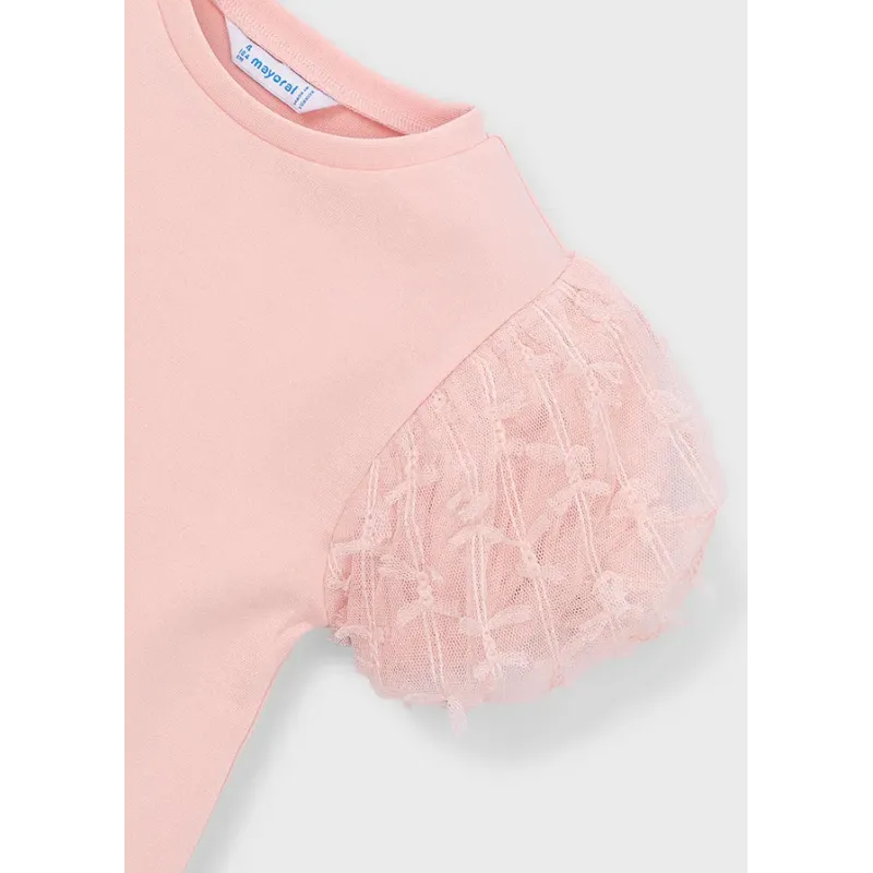 Koszulka z bufiastym, krótkim rękawkiem wykonanym z tiulu dla dziewczynki. Skład: 56% Wiskoza, 37% Poliester, 4% Bawełna, 3% Elastan.