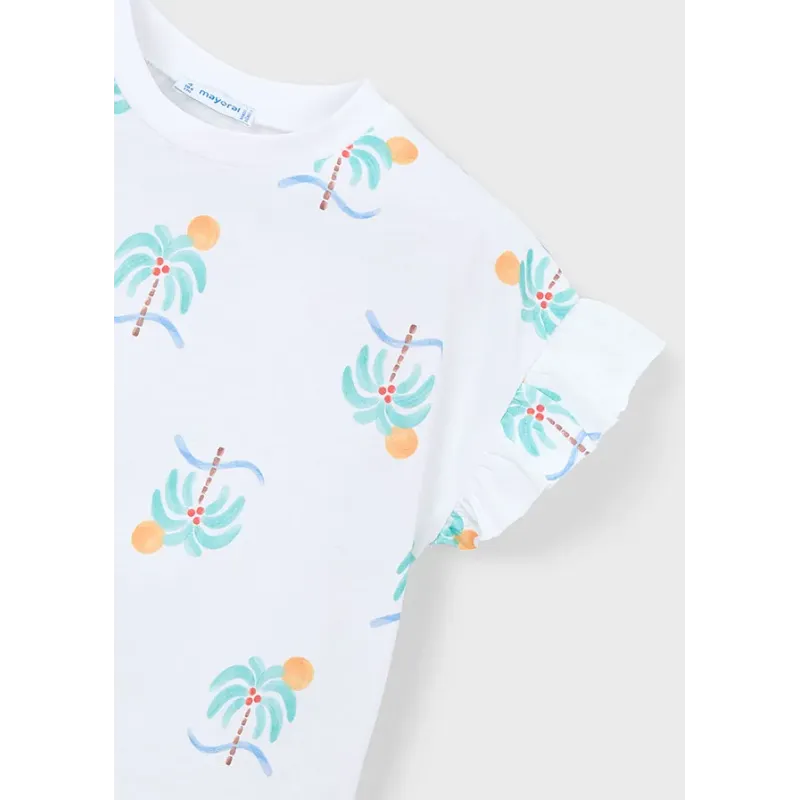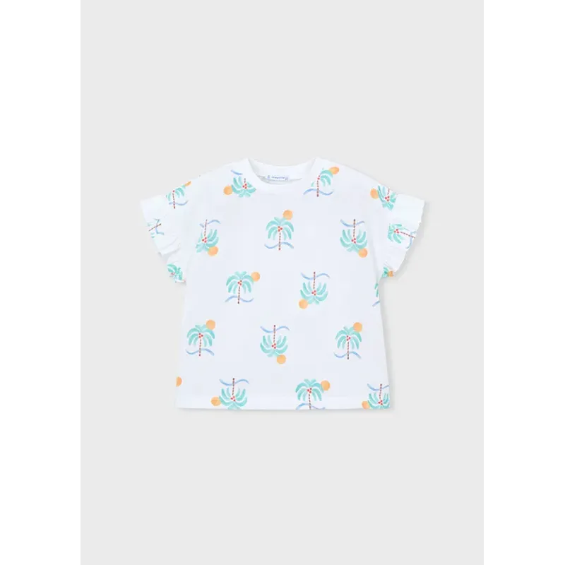 Luźna koszulka z krótkim rękawkiem we wzory dla dziewczynki. Skład: 100% bawełna.