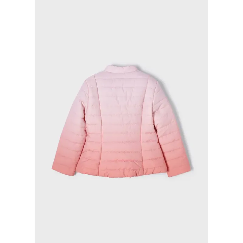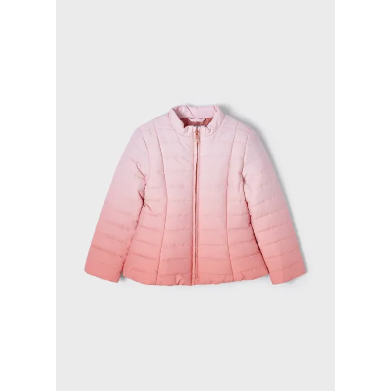 Kurtka przeciwwiatrowa z długim rękawem dla dziewczyny. Okrągły dekolt. Zapięcie na środku na zamek błyskawiczny. Lekka, oddychająca i bardzo wygodna tkanina techniczna. Model gładki z efektem ombre.