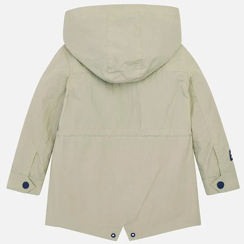 Przedłużana parka dla chłopca. Okrągły dekolt. Ubranko z odpinanym kapturem. Zapięcie na środku na zamek błyskawiczny i guziki. Lekka, oddychająca i bardzo wygodna tkanina techniczna. Dekoracyjne imitowane kieszenie z przodu. Skład: 98% Bawełna 2% Elasta
