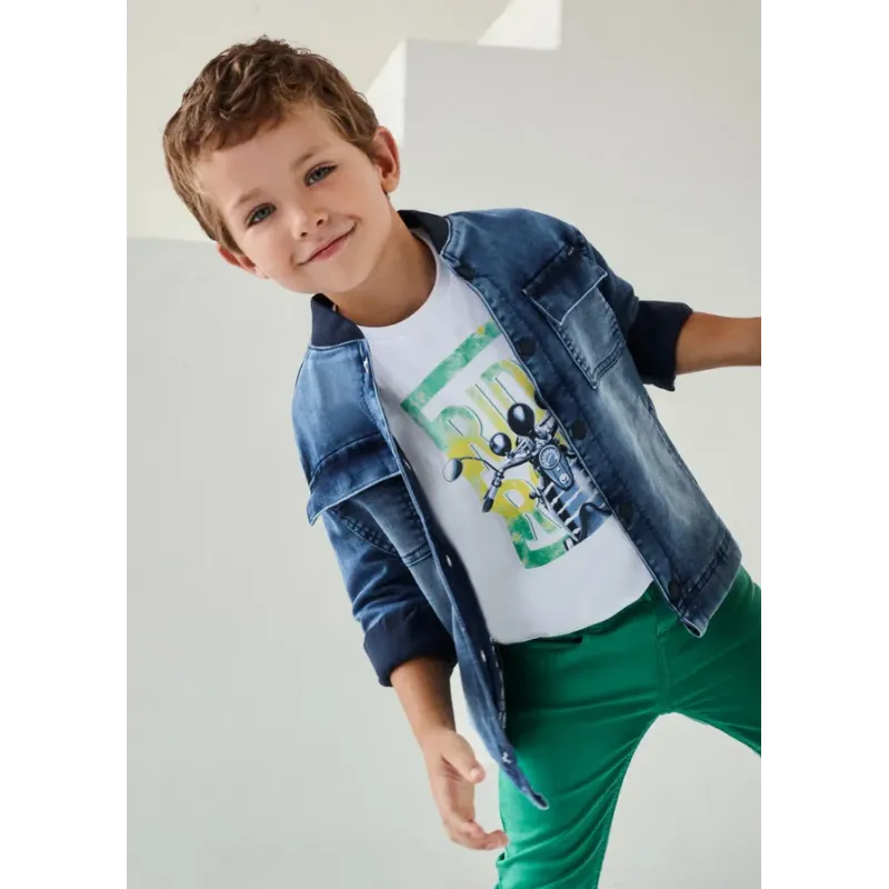 Kurtka jeansowa z bawełny zrównoważonej dla chłopca. Kurtka z długim rękawem. Kołnierzyk koszulowy. Zapięcie z przodu na guziki. Jeansowa tkanina z efektem sprania. Z przodu funkcjonalne kieszenie. Skład: 98% Bawełna, 2% Elastan.