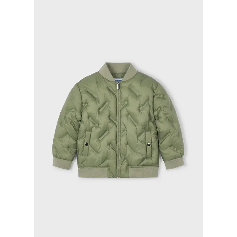 Przejściowa kurtka bez kaptura dla chłopca. Kołnierz ze stójką. Zapięcie na środku na zamek błyskawiczny. Ciepła, techniczna tkanina pikowana. Kieszenie na przodzie zapinane na guzik. Model ze ściągaczami. Skład: 61% Poliester, 38% Poliamid, 1% Elastan.