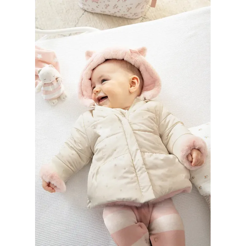Kurtka z długim rękawem dla noworodka dziewczynki. Kołnierz z kapturem. Odpinany kaptur z futerkowym wykończeniem. Model o długości do pasa. Zapięcie na środku na zamek błyskawiczny. Ozdoby: aplikacje uszek. Artykuł ten jest modelem dwustronnym.