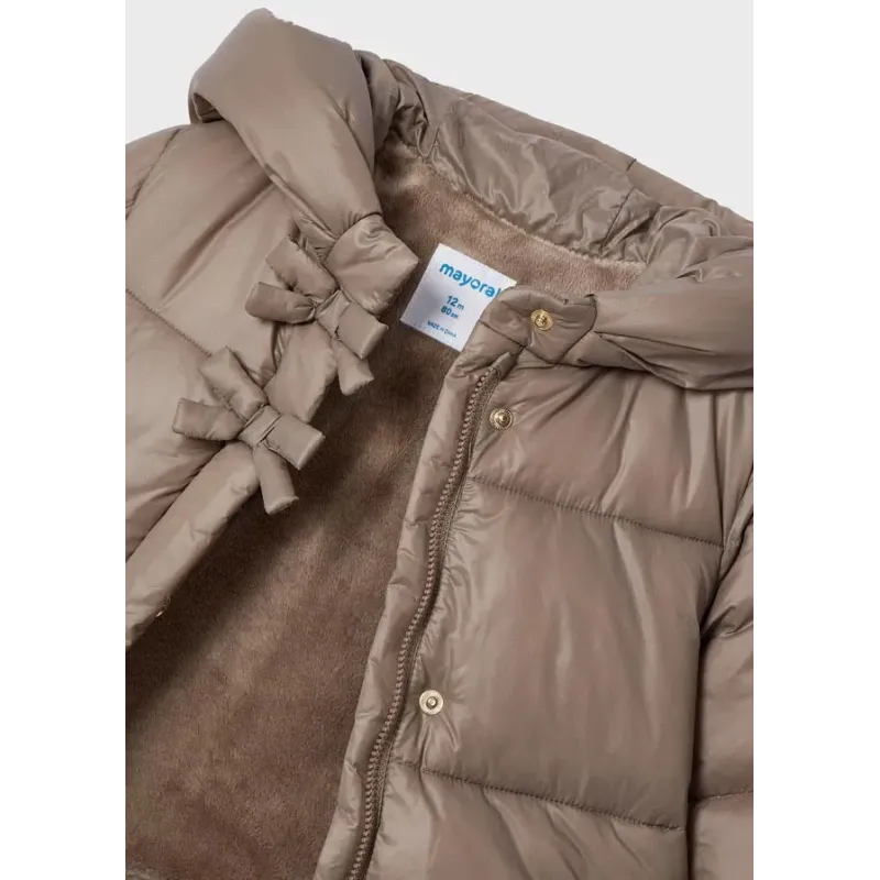 Płaszcz z długim rękawem dla niemowlęcia. Zapięcie na ukryte zatrzaski, które pozwolą w łatwy sposób założyć ubranko. Delikatna i gustowna zewnętrzna tkanina z misia