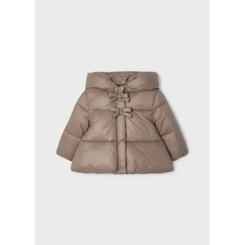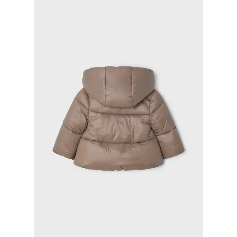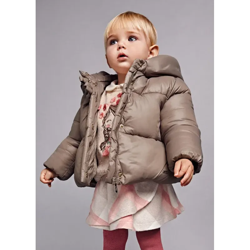 Płaszcz z kapturem dla dziewczynki. Kaptur wykończony futerkiem. Zapięcie na środku na zamek błyskawiczny. Lekka, oddychająca i bardzo wygodna tkanina techniczna. Ozdoby: pikowana tkanina. Skład: 66% Poliester, 34% Poliamid.