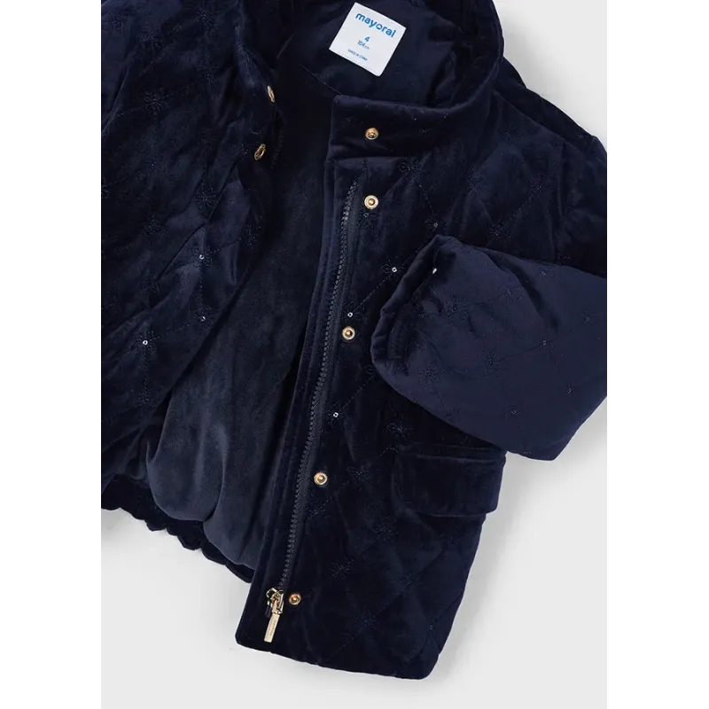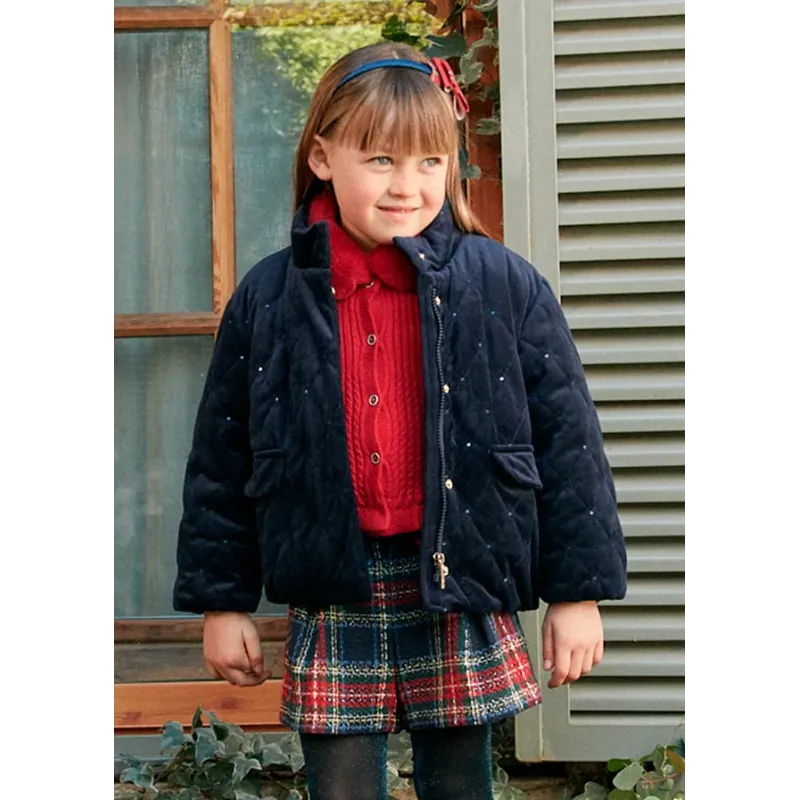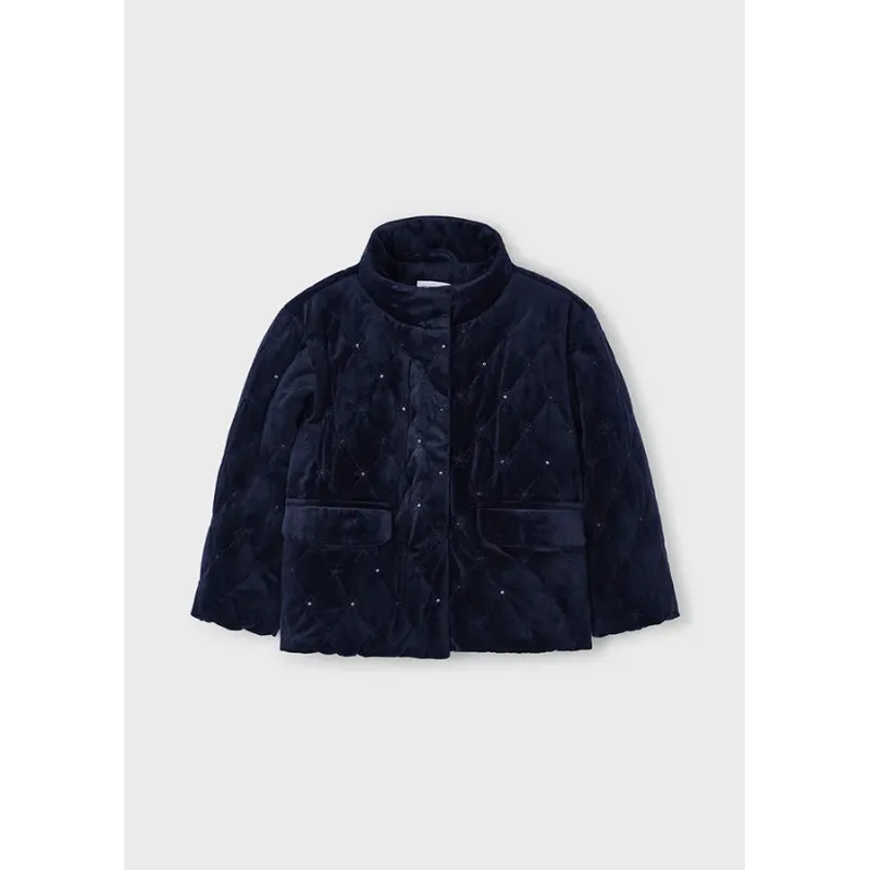 Aksamitna kurtka z długim rękawem dla dziewczyny. Okrągły dekolt ze stójką. Zapięcie na zamek błyskawiczny z przodu. Pikowana, aksamitna tkainna w gwiazdki. Skład: 100% Poliester.