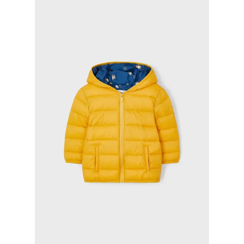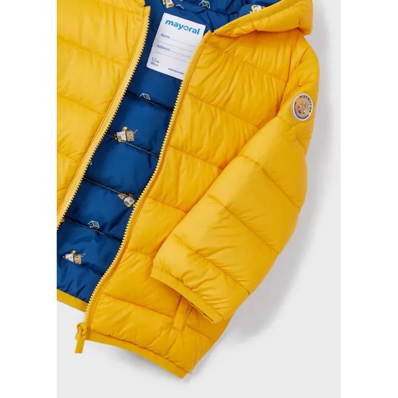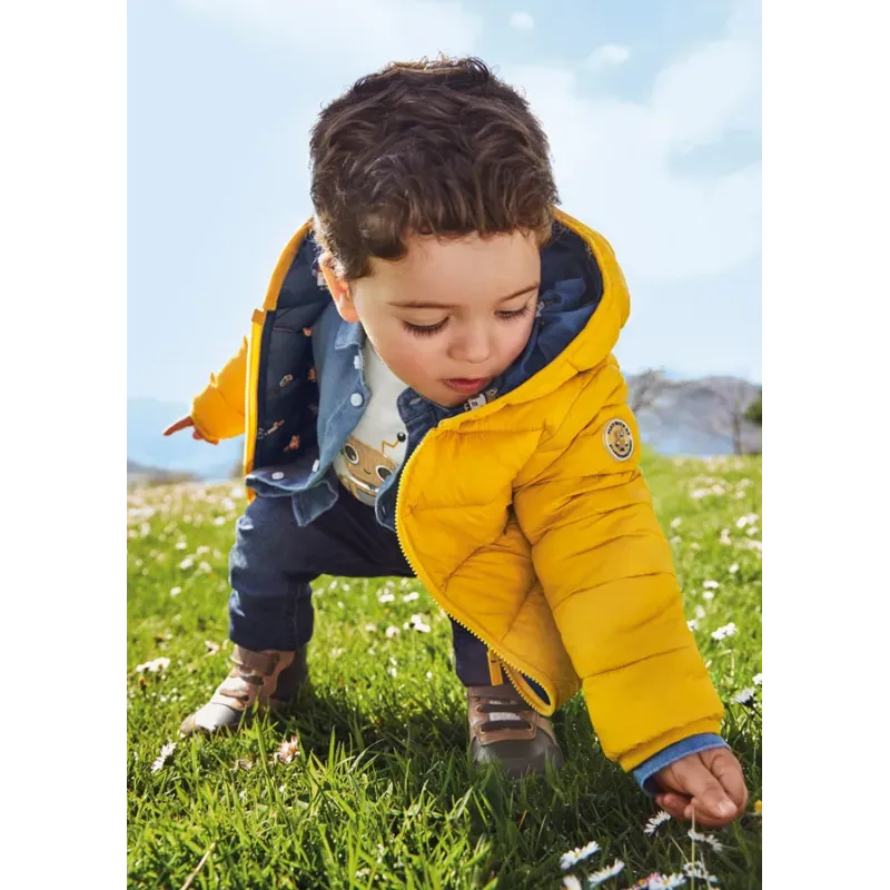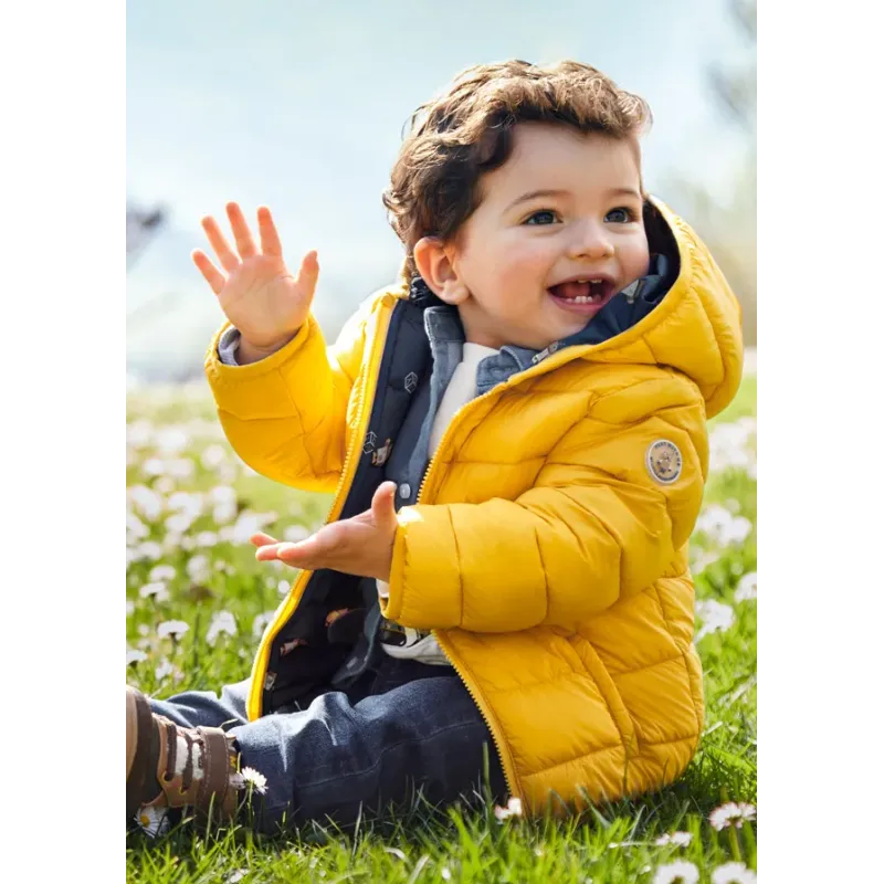 Kurtka z długim rękawem dla chłopca. Półgolf. Ubranko z odpinanym kapturem. Zapięcie na środku na zamek błyskawiczny. Lekka, oddychająca i bardzo wygodna tkanina techniczna. Wewnętrzna podszewka z ociepliną zachowującą lekkość.