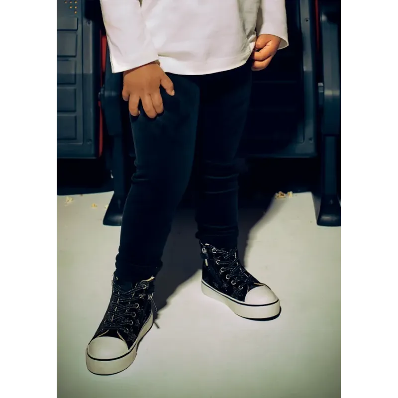 Legginsy długie z bawełny zrównoważonej dla dziewczynki. Model typu dzwony. Elastyczna gumka w pasie dla lepszego dopasowania. Projekt gładki z funkcjonalnymi kieszeniami z przodu ubranka. Imitacja jeansu. Skład: 70% Bawełna, 25% Poliester, 5% Elastan.
