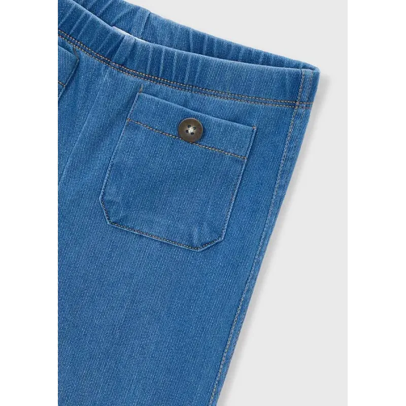 Prążkowane legginsy gładkie z rozszerzanymi nogawkami dla dziewczynki. Elastyczna i miękka tkanina. Model wykończony falbanką. Z przodu kieszonki zapinane na guzik. Skład: 95% Bawełna, 5% Elastan.