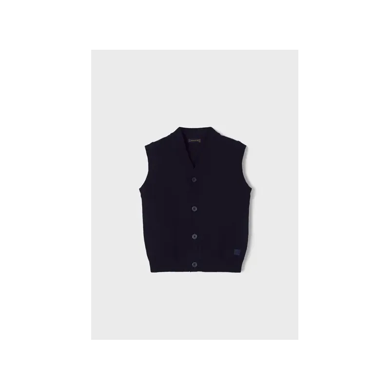 Kamizelka bez rękawków dla chłopca. Dekolt w serek. Zapięcie na środku na guziki. Model gładki. Skład: 60% Bawełna 30% Poliamid 10% Wełna