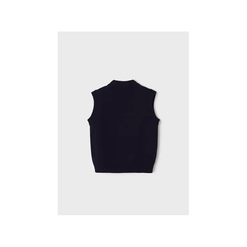 Kamizelka bez rękawków dla chłopca. Dekolt w serek. Zapięcie na środku na guziki. Model gładki. Imitacja kieszeni. Poliestrowa podszewka. Skład: 57% Poliester, 43% Bawełna.