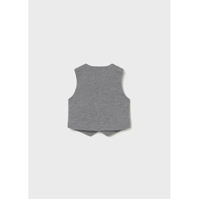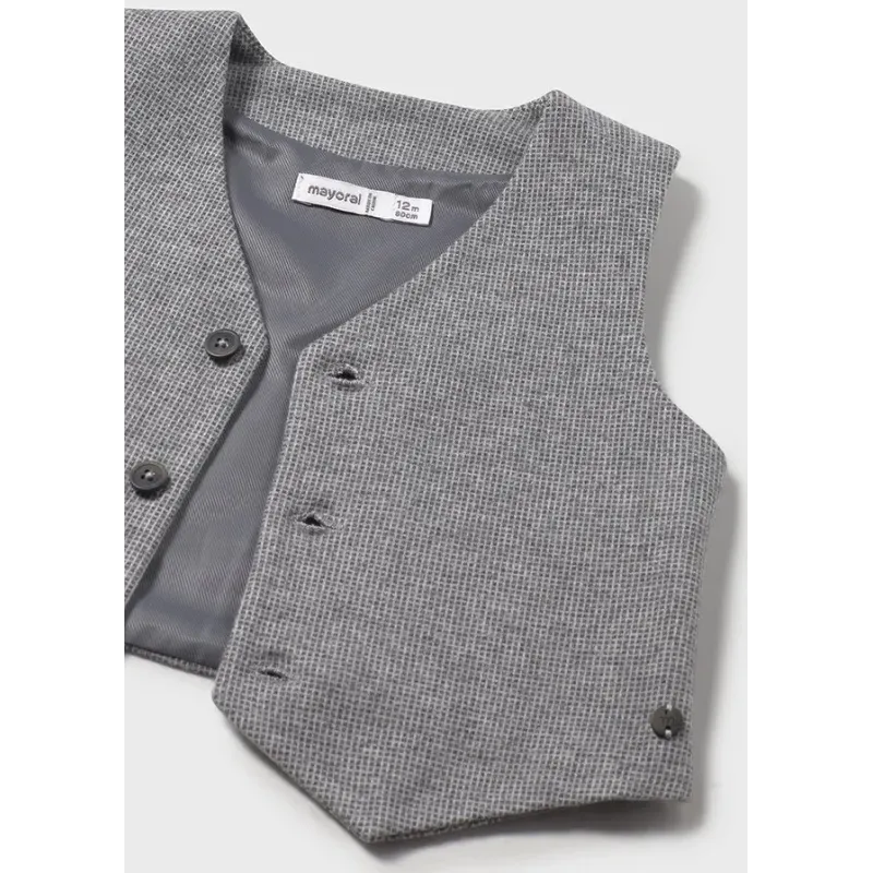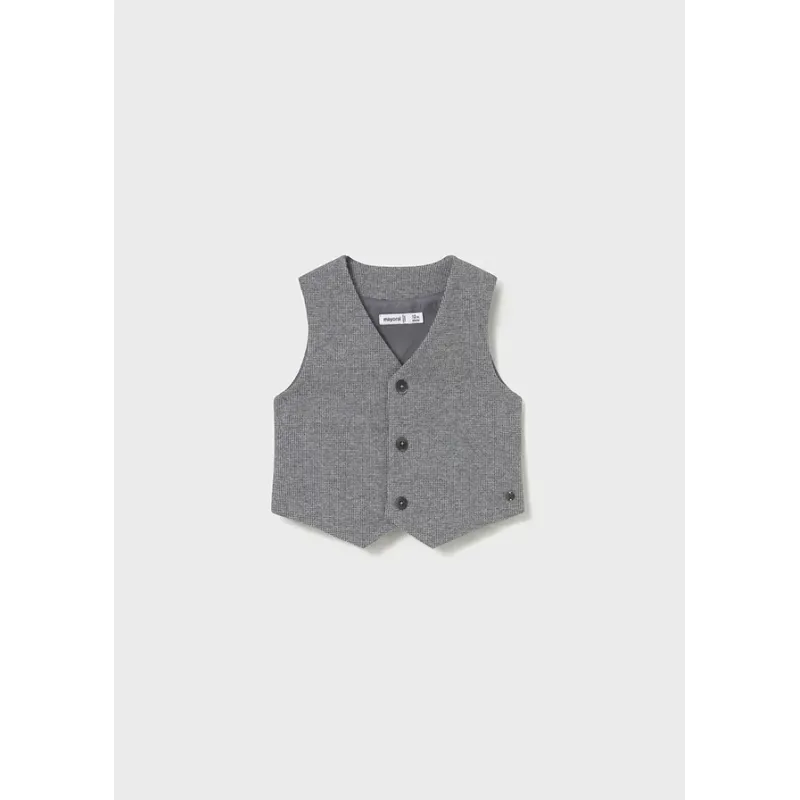 Elegancka kamizelka dla chłopca. Zapięcie na trzy guziczki. Dekolt w szpic. Skład: 88% Bawełna, 12% Len.