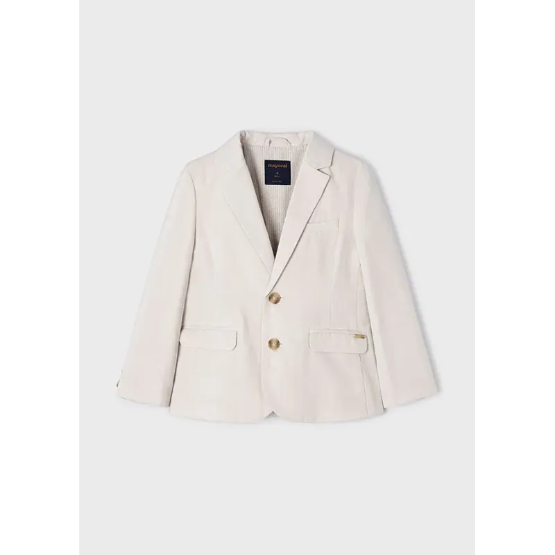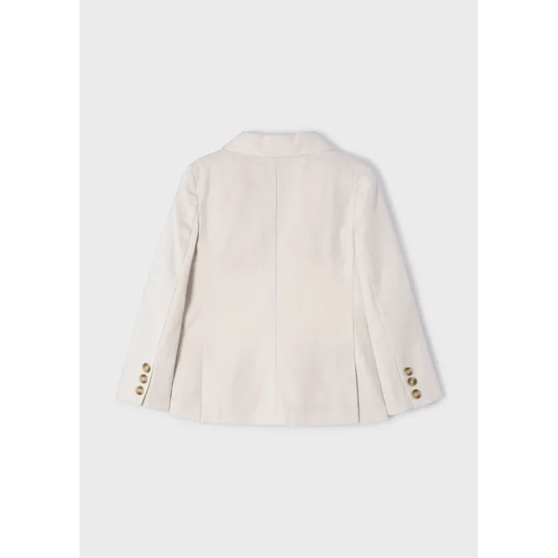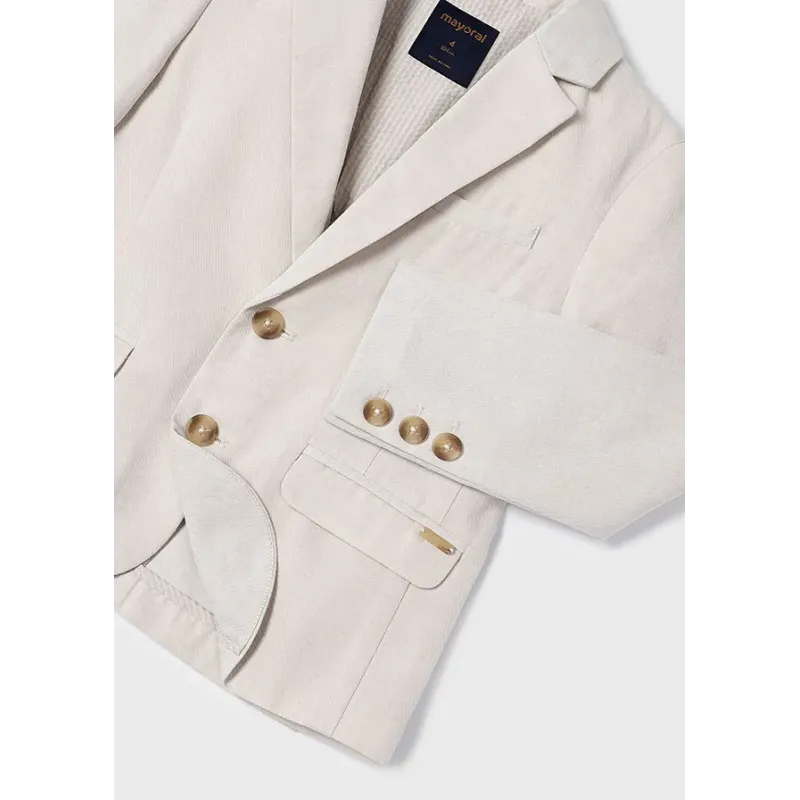 Marynarka z długim rękawem slim dla chłopca. Kołnierzyk z klapami. Zapięcie z przodu na guziki. Z przodu funkcjonalne kieszenie. Skład: 86% Bawełna, 14% Len.