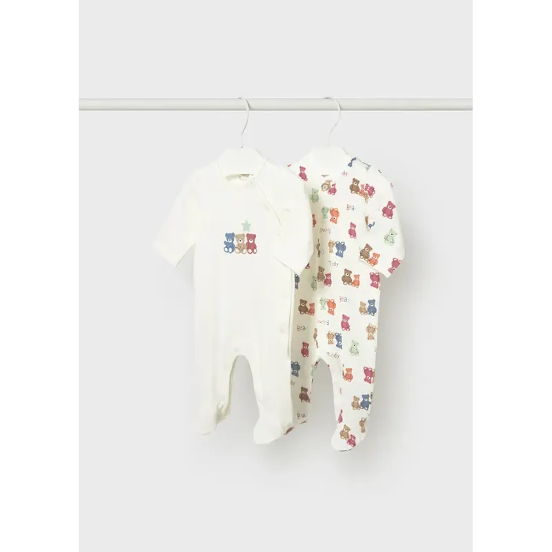 Zestaw 2 piżamek z bawełny zrównoważonej dla chłopca. Piżama z długim rękawem dla noworodka. Zapięcie na zatrzaski z przodu. Zapięcie na zatrzaski w kroku ułatwiające zakładanie. Większe rozmiary (12 i 18 miesięcy) posiadają antypoślizgową podeszwę.