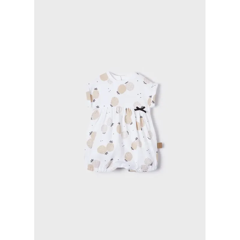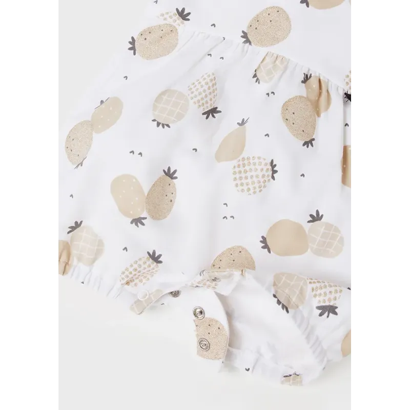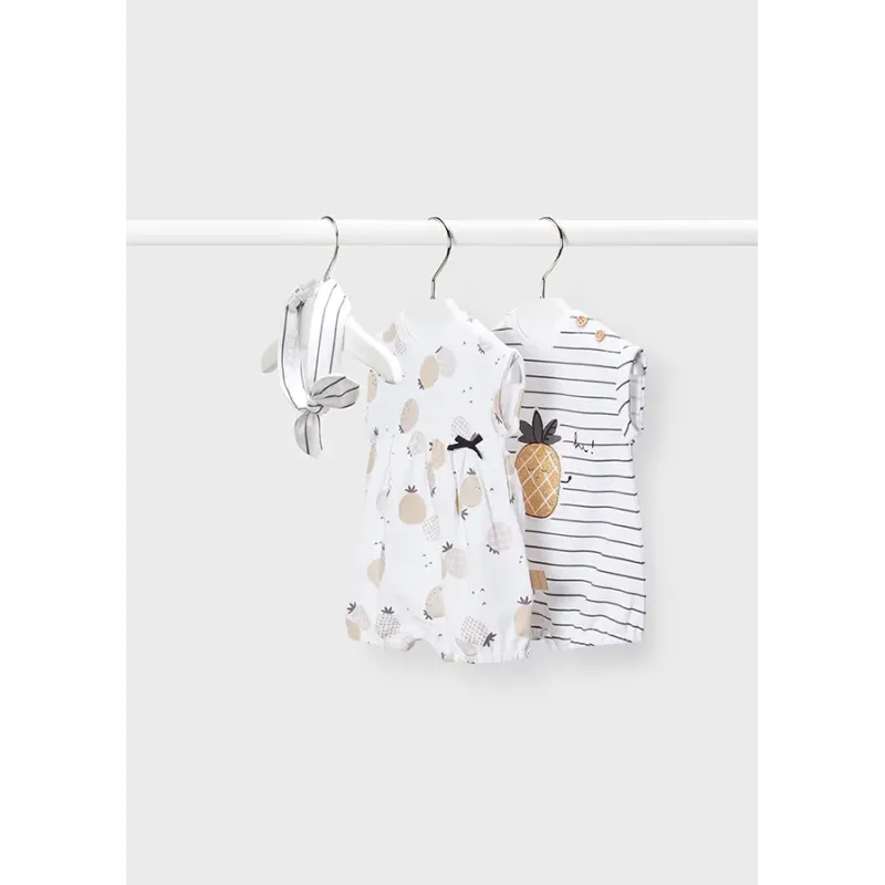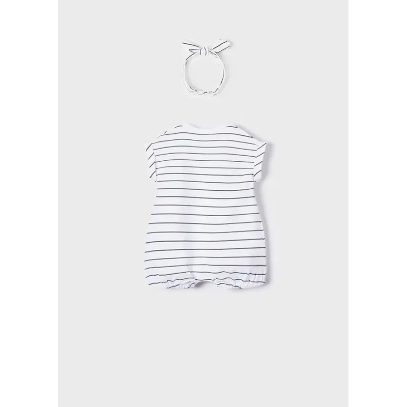 Oryginalny zestaw 2-częściowy dla dla noworodka dziewczynki. Piżama na szerokich ramiączkachi. Okrągły dekolt. Zapięcie na małe zatrzaski w na obu ramionach, które ułatwiają szybkie i wygodne założenie ubranka. Zestaw z opaską.