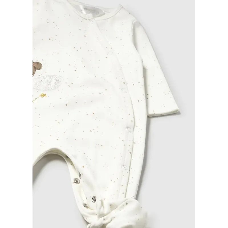 Oryginalny zestaw 2-częściowy dla dla noworodka dziewczynki. Piżama na szerokich ramiączkachi. Okrągły dekolt. Zapięcie na małe zatrzaski w na obu ramionach, które ułatwiają szybkie i wygodne założenie ubranka. Zestaw z opaską.