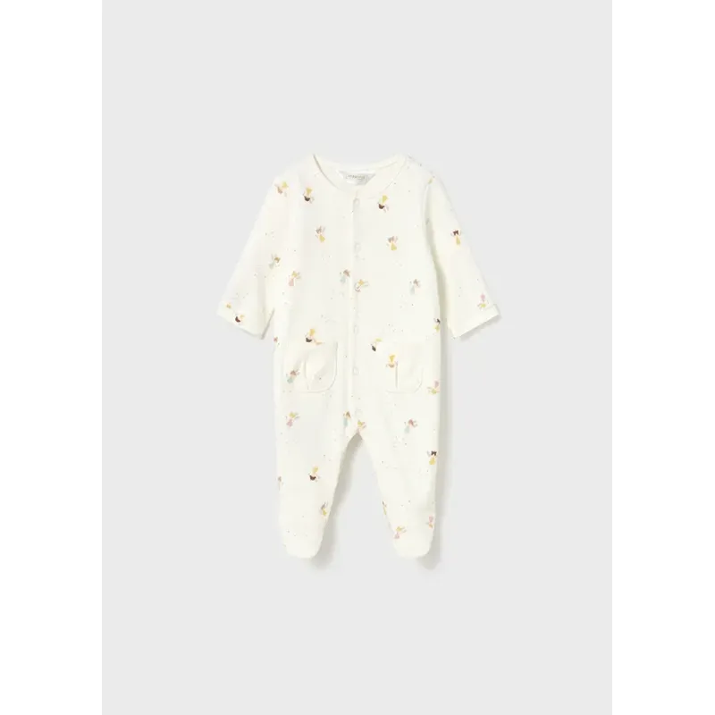 Piżamka ze stópkami dla dziewczynki. Zapięcie na zatrzaski z boku. Zapięcie na guziki w kroku. Model z nadrukiem. Większe rozmiary tego modelu (12 i 18 miesięcy) posiadają antypoślizgową podeszwę. Skład: 95% Bawełna, 5% Elastan