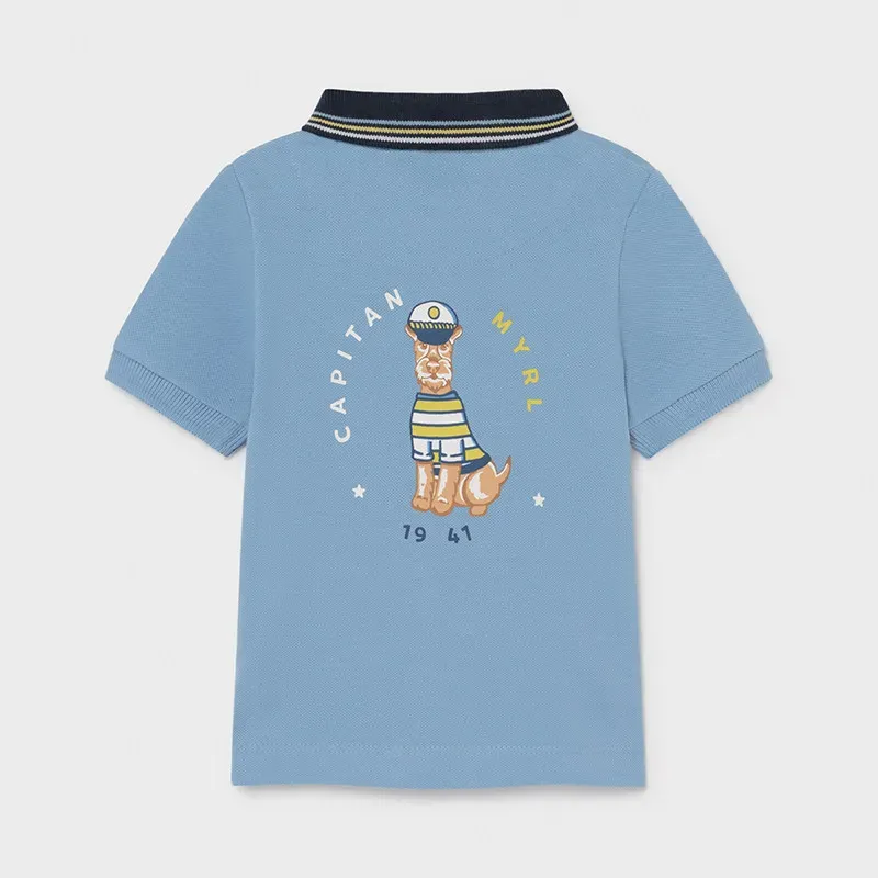 Polo z krótkim rękawem dla chłopca Baby. Kołnierzyk polo z detalami w kontrastowym odcieniu kolorystycznym. Model o prostym kroju. Wygodna dzianina. Ozdoby: ozdobny haft. Projekt z nadrukiem.